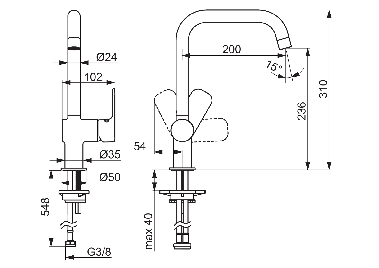 - Páka se symboly teplé a studené vody; Jedna ovládací páka / rukojeť