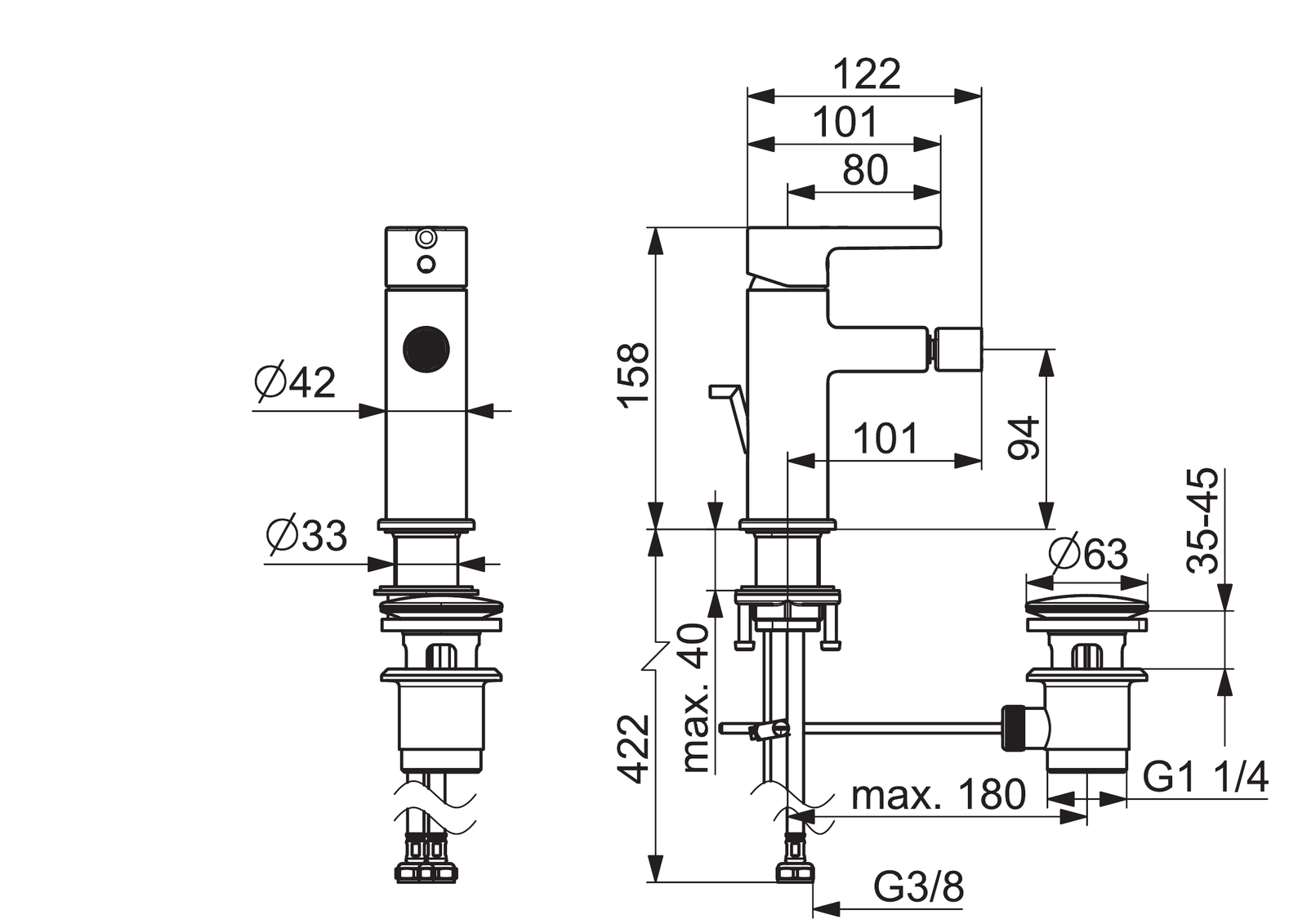 - Jedna ovládací páka / rukojeť; Pin - ovládací páka s tyčinkou; Páka se symboly teplé a studené vody
