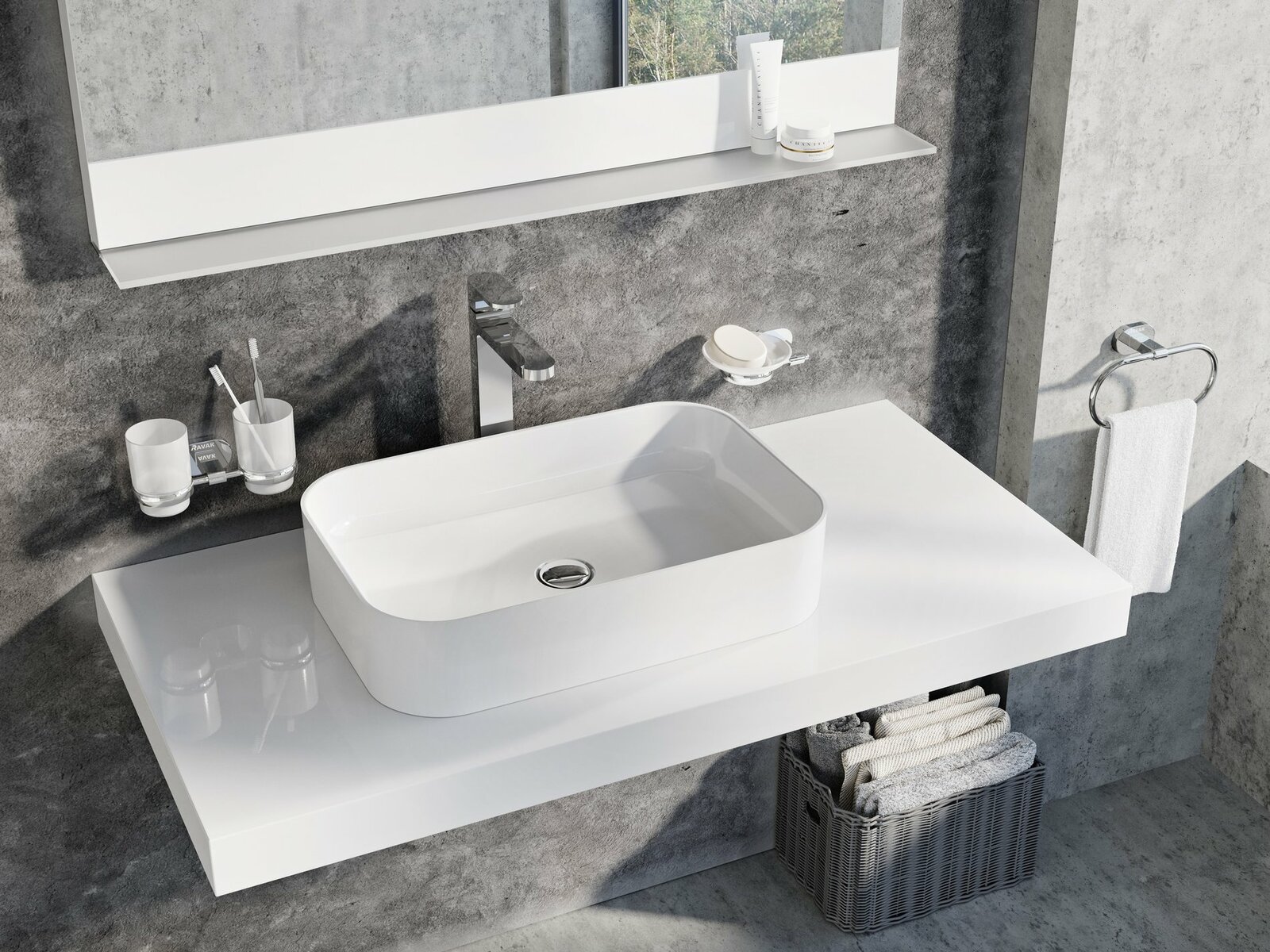 - doplňky k dokoupení: deska pod umyvadlo / skříňka pod umyvadlo na desku, umyvadlová pileta pevná, sifon chromový nebo nábytkový, extra prodloužené baterie Chrome nebo 10°