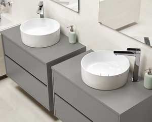 Skříň CREA je příkladem nadčasového minimalistického designu dosaženého díky bezúchytkovým čelům. Je vyroben z dřevotřískové desky odolné proti vlhkosti, má přední stranu v dubové barvě a elegantní vnitřek s šedým lněným povrchem. Verze na desku umožňuje vytvořit moderní interiér pomocí vyhrazených tenkostěnných umyvadel CREA na desku.
