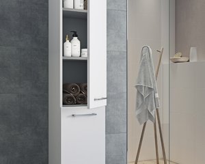 Sloup LARA z šedé lakované dřevotřísky, univerzální uchycení dvířek a chromové úchytky. Tento kus nábytku vyžaduje vlastní montáž.