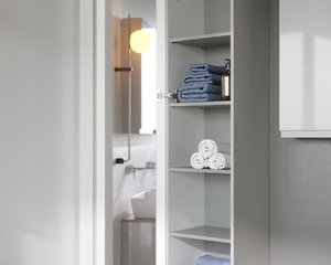 Tento prostorný úložný díl koupelnových doplňků je povrchově upraven v lesklém bílém laku. Vyznačuje se pohodlnými frézovanými rukojeťmi. Na vnitřní straně dveří je namontováno velké vertikální zrcadlo. Pro větší pohodlí mají dveře 165stupňové panty, které umožňují široké otevření. Je také vybavena systémem soft-close.