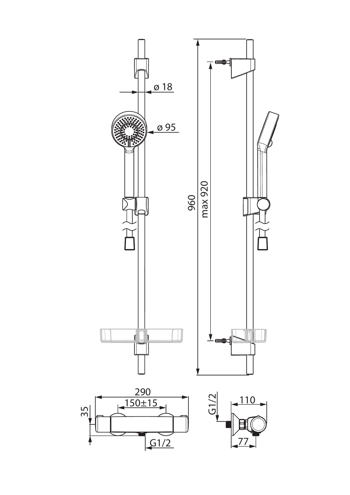 - Ruční sprcha; Sprchová tyč; Sprchová tyč s nastavitelnou roztečí úchytů; Mýdelník; Sprchová hadice (1750 mm)