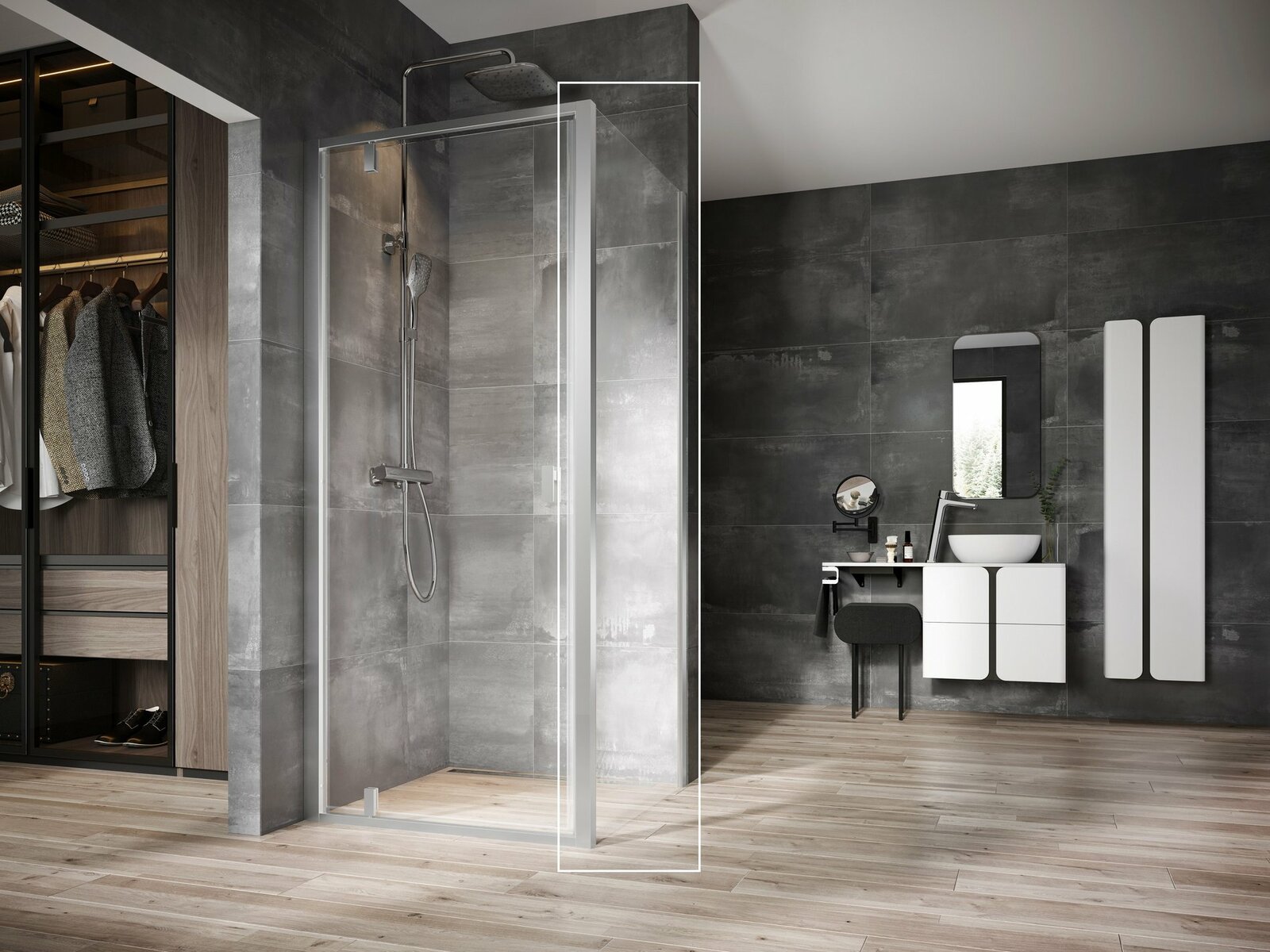 Výrobek se skládá z jednoho rovného pevného dílu a jednoho rovného otočného dílu, který tvoří dveře. Otočením výrobku o 180° získáte levou nebo pravou variantu otevírání dveří. Montuje se do obloženého rohu koupelny (ideálně do vyzděné niky nebo v kombinaci s pevnou stěnou NPSS) na vaničky Ravak Gigant, Gigant Pro, Gigant Pro Flat, Gigant Pro Chrome nebo přímo na podlahu se zabudovaným odtokovým žlabem či podlahovou vpustí. Kombinací se dvěma pevnými stěnami typu NPSS vytvoříte sprchový kout ve tvaru „U“. Použitím nastavovacího profilu NNPS lze výrobky rozšířit o 20 mm, proto se dokonale přizpůsobí stavebním nerovnostem až o 4 cm na každé straně.