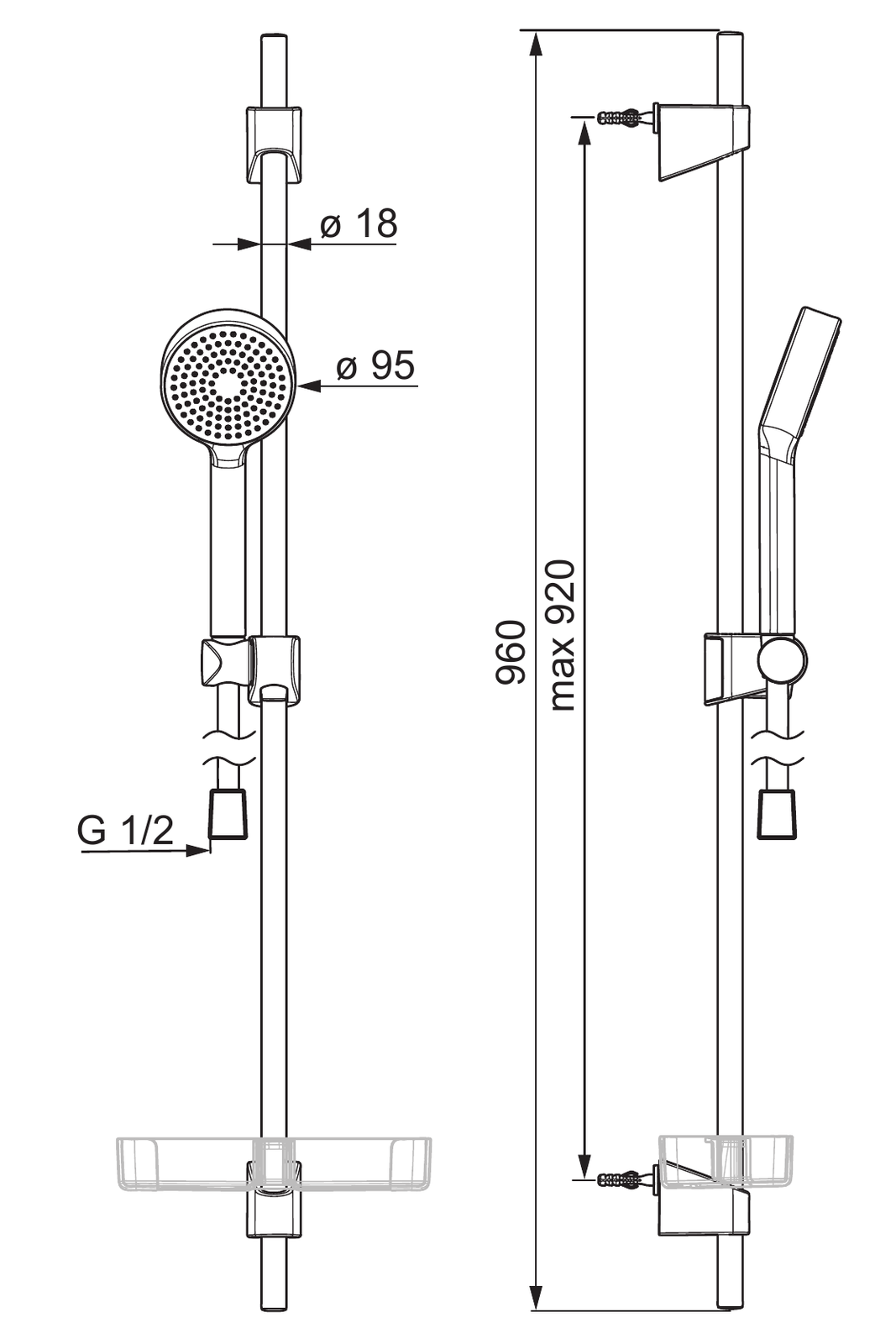 - Ruční sprcha; Sprchová tyč; Sprchová tyč s nastavitelnou roztečí úchytů; Mýdelník; Sprchová hadice (1750 mm); Technologie proti usazeninám (snadno se čistí)
