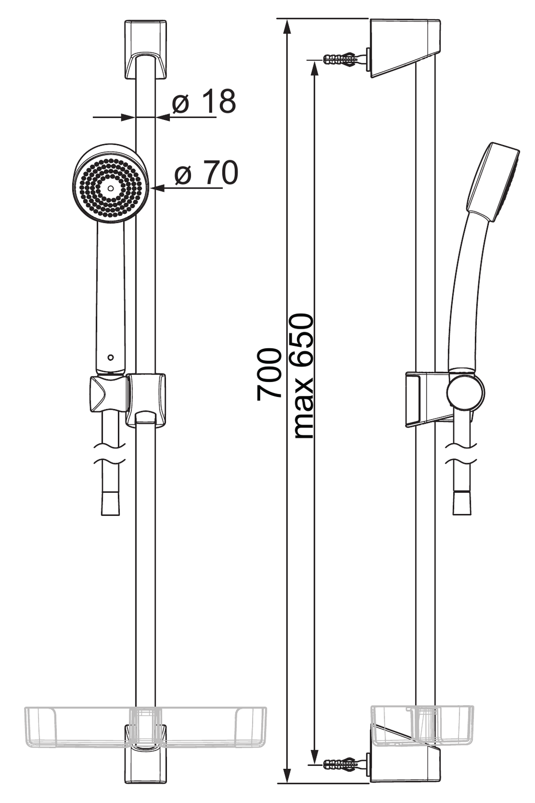 - Ruční sprcha; Sprchová tyč; Sprchová tyč s nastavitelnou roztečí úchytů; Mýdelník; Sprchová hadice (1500 mm); Technologie proti usazeninám (snadno se čistí)