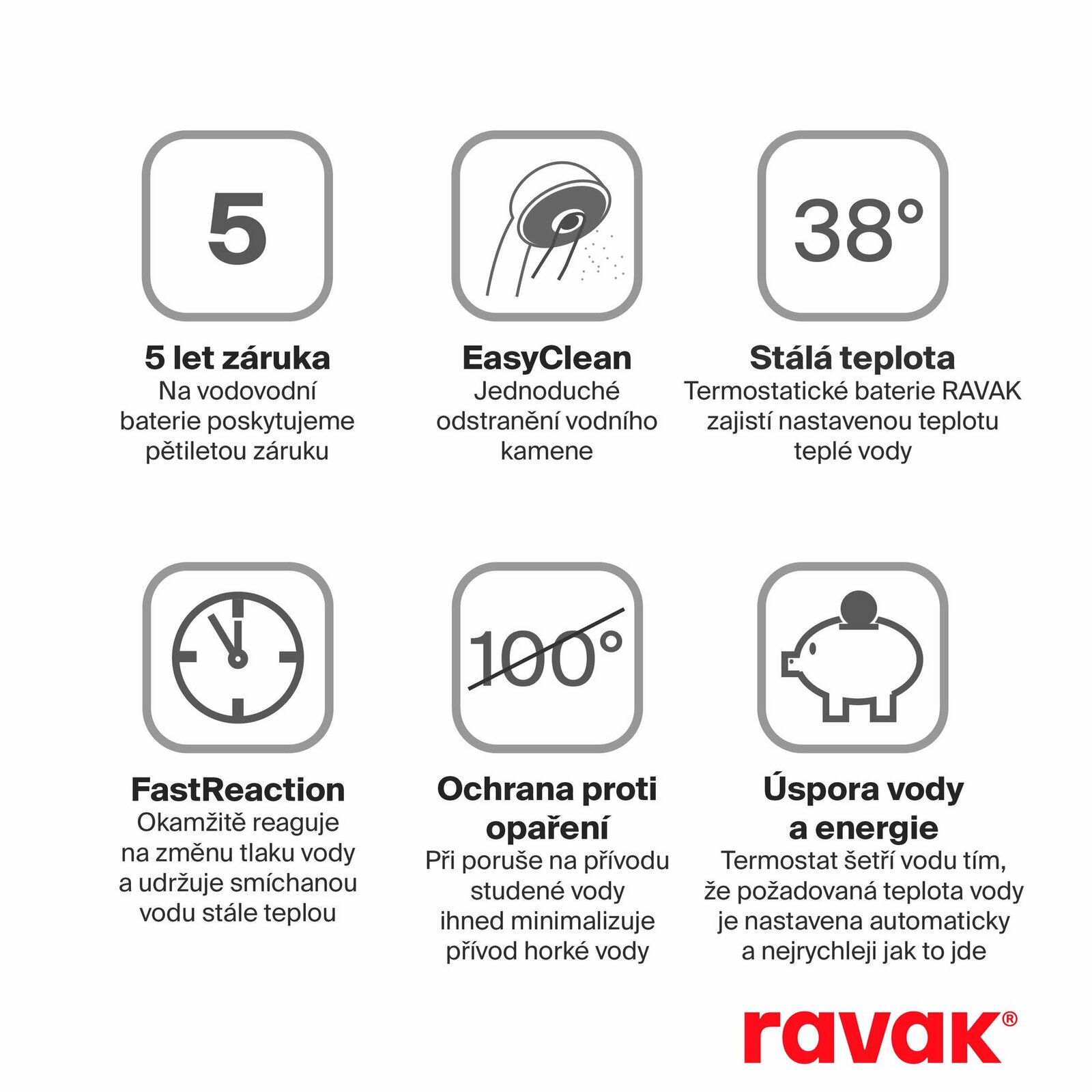 Sprchový sloup s termostatickou baterií lze kombinovat s ostatními výrobky Ravak. Na vnější čištění doporučujeme používat přípravek Ravak Cleaner Chrome.