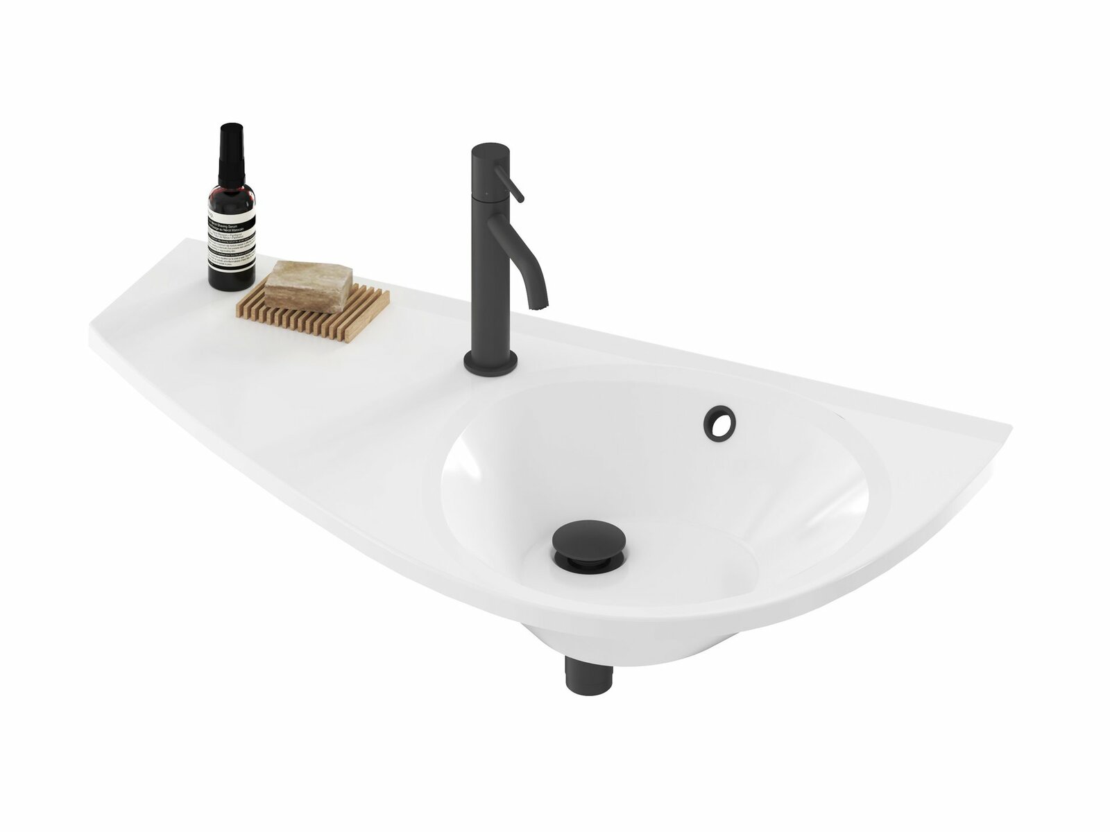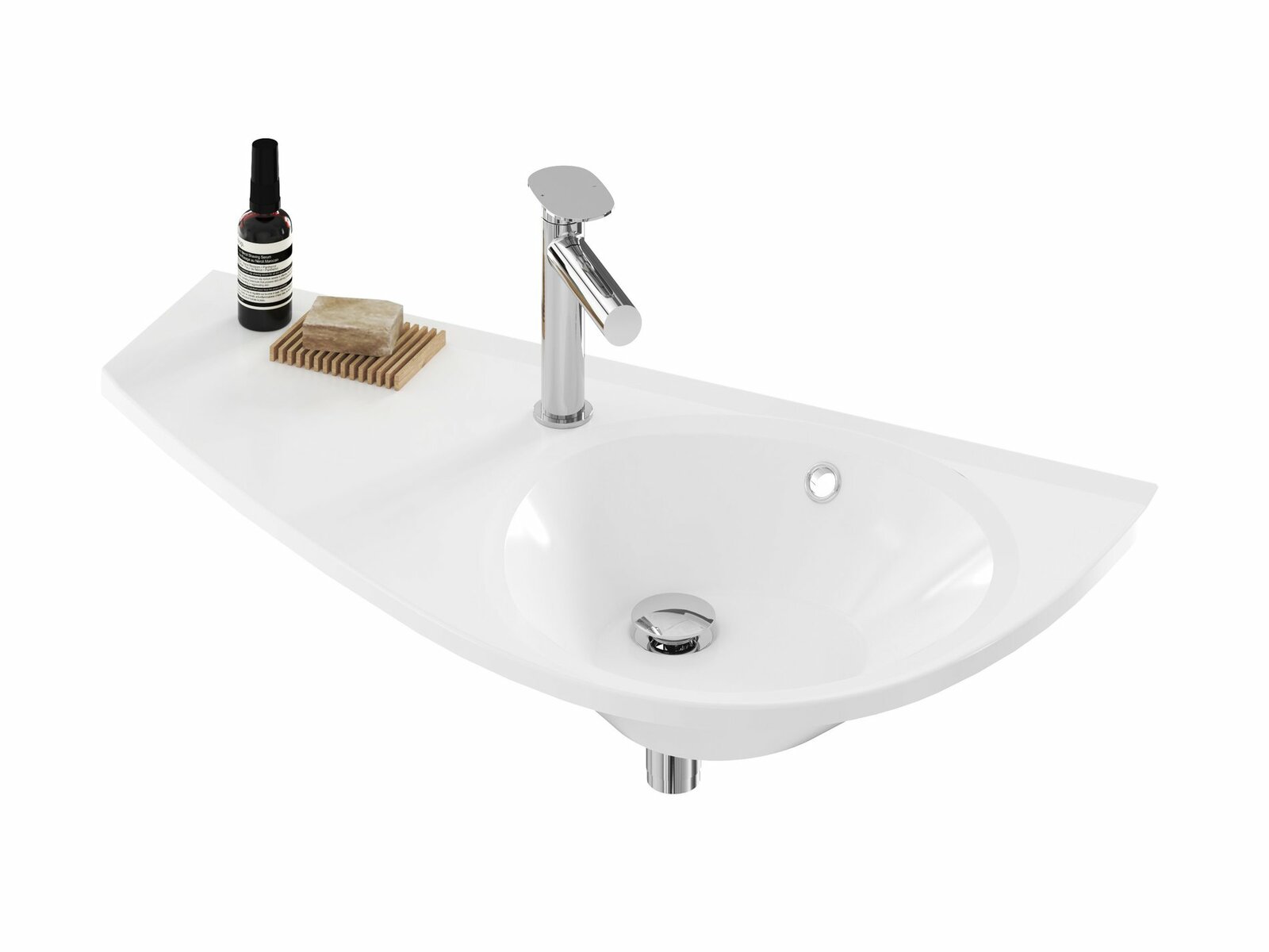 Závěsné umyvadlo z litého mramoru Avocado k instalaci na zeď, s přepadem. Bílé provedení. Levá varianta.- rozměry (šxh): 85 x 45 cm