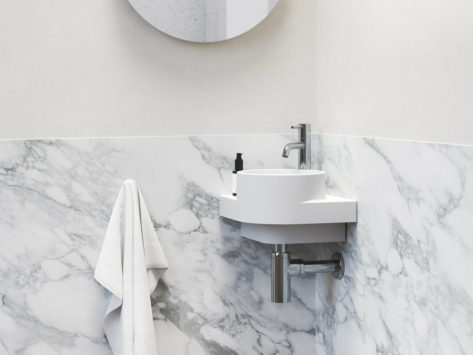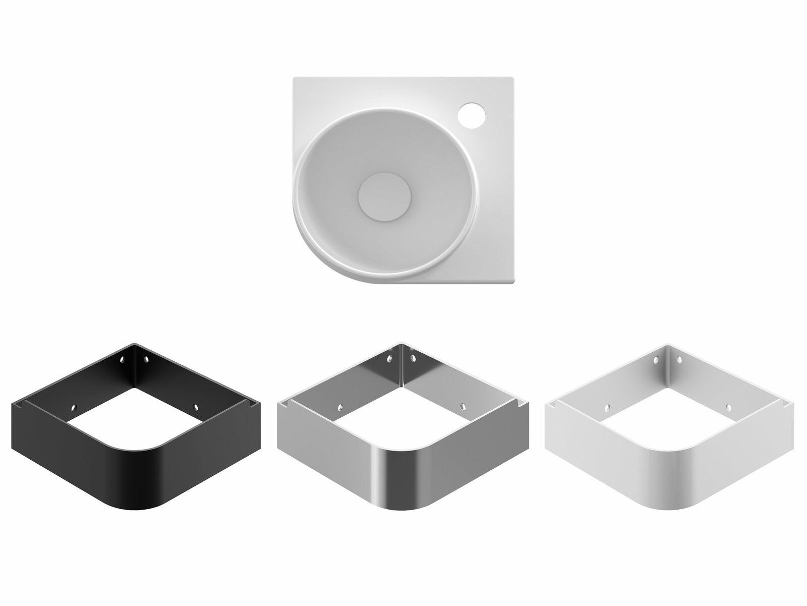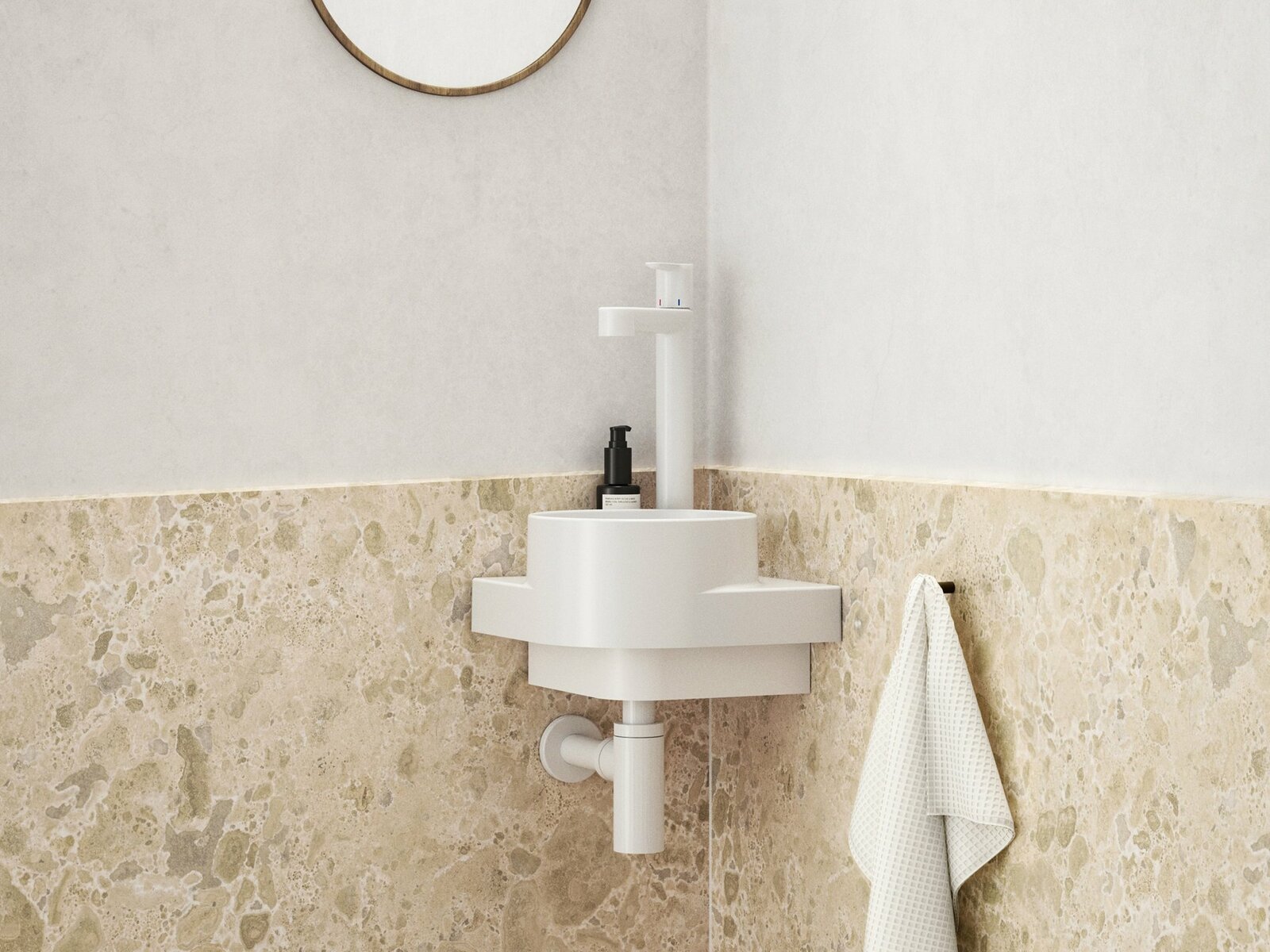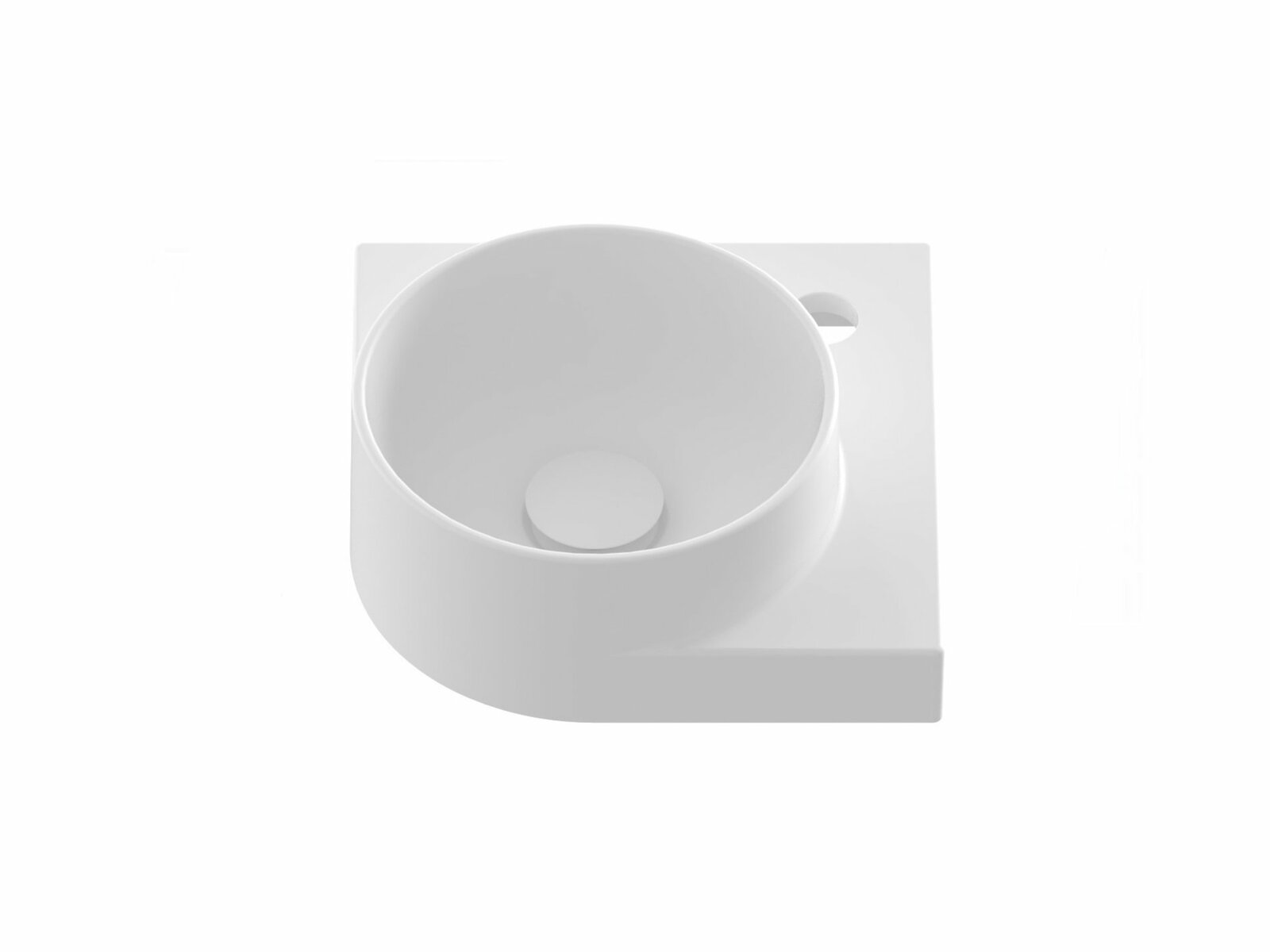 Tenkostěnné keramické rohové umývátko Yard k instalaci na konzoli Yard, bez přepadu. Bílé matné provedení. S otvorem pro stojánkovou baterii.