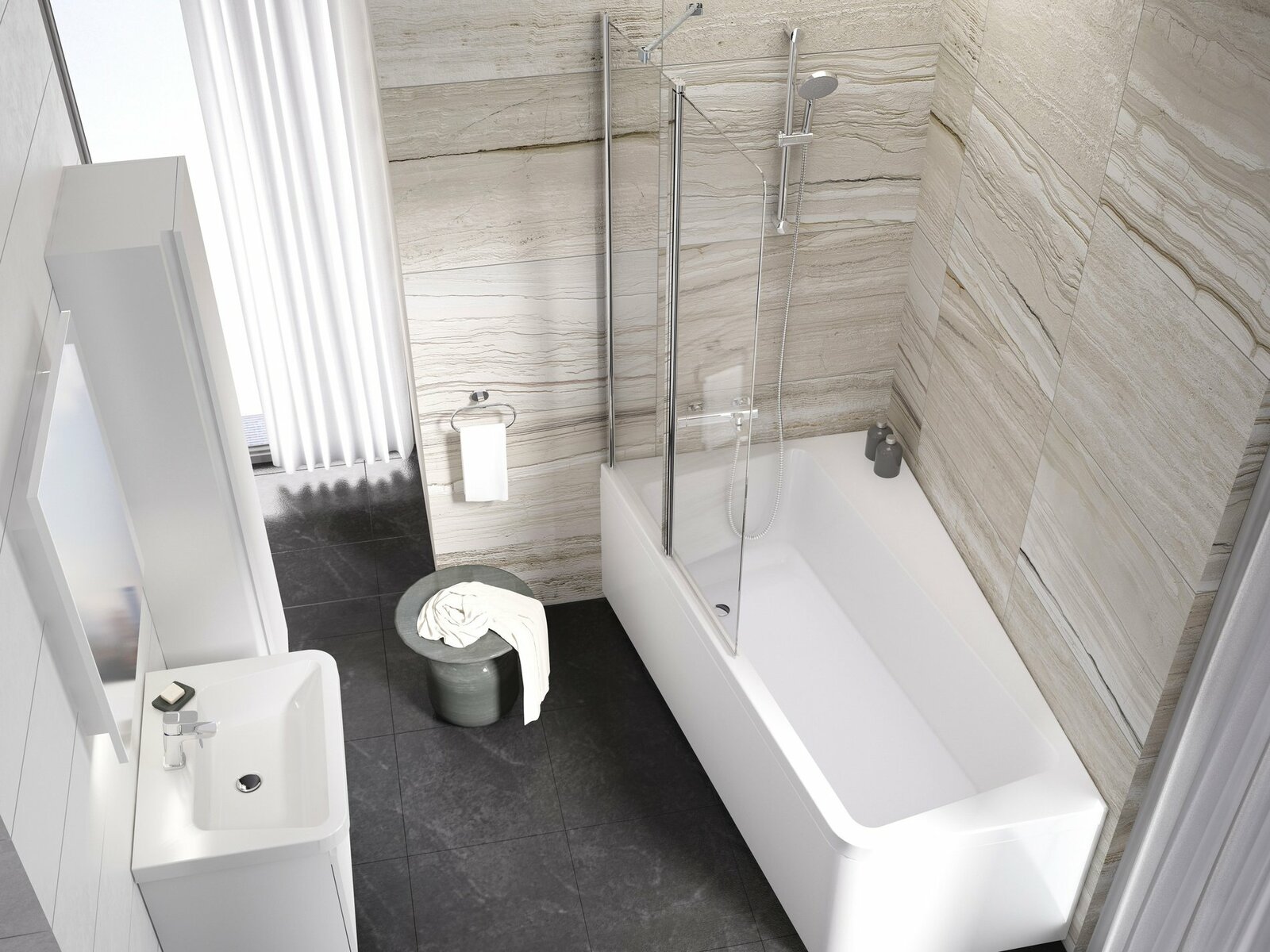 Kvalitní skleněná zástěna je vhodná na asymetrickou vanu 10° a se skládá z jednoho pevného a jednoho pohyblivého dílu, který lze sklopit dovnitř vany nebo ven vedle ní. Zástěna tak maximálně zpříjemňuje vstup do vany a usnadňuje čištění. Vzpěra pro fixaci skla je součástí balení.
