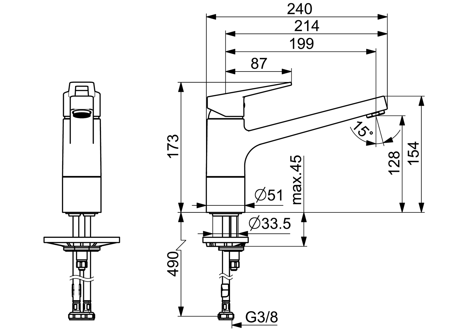 - Jedna ovládací páka / rukojeť; Třmenová páka; Páka se symboly teplé a studené vody