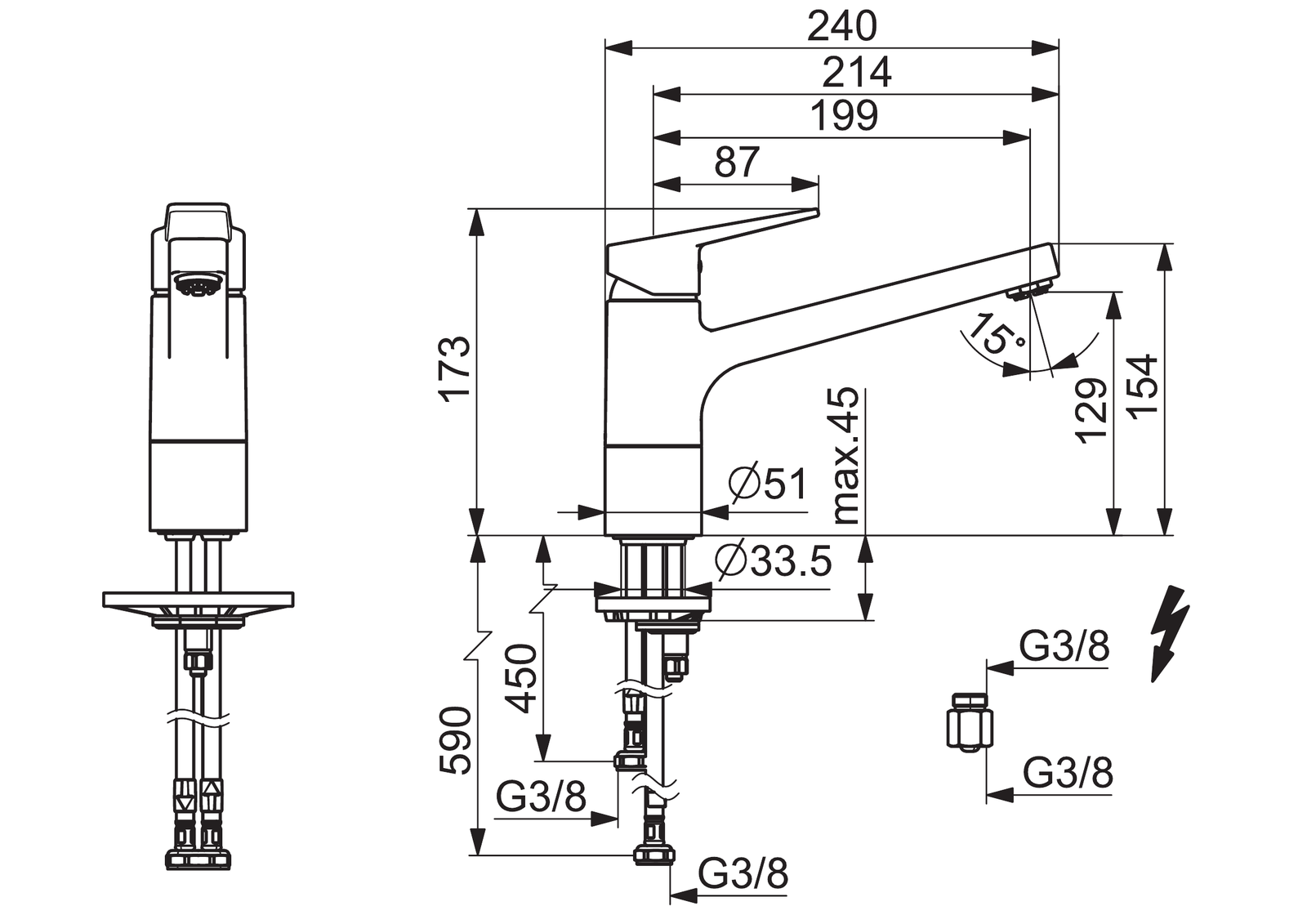 - Páka se symboly teplé a studené vody; Jedna ovládací páka / rukojeť
