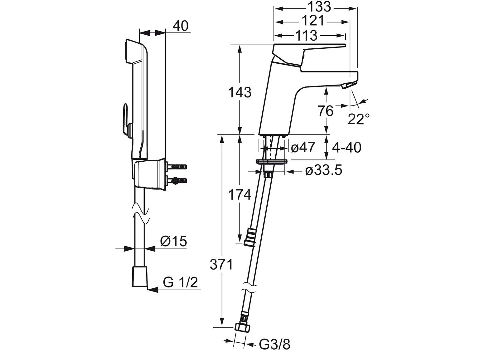 - Páka se symboly teplé a studené vody; Jedna ovládací páka / rukojeť