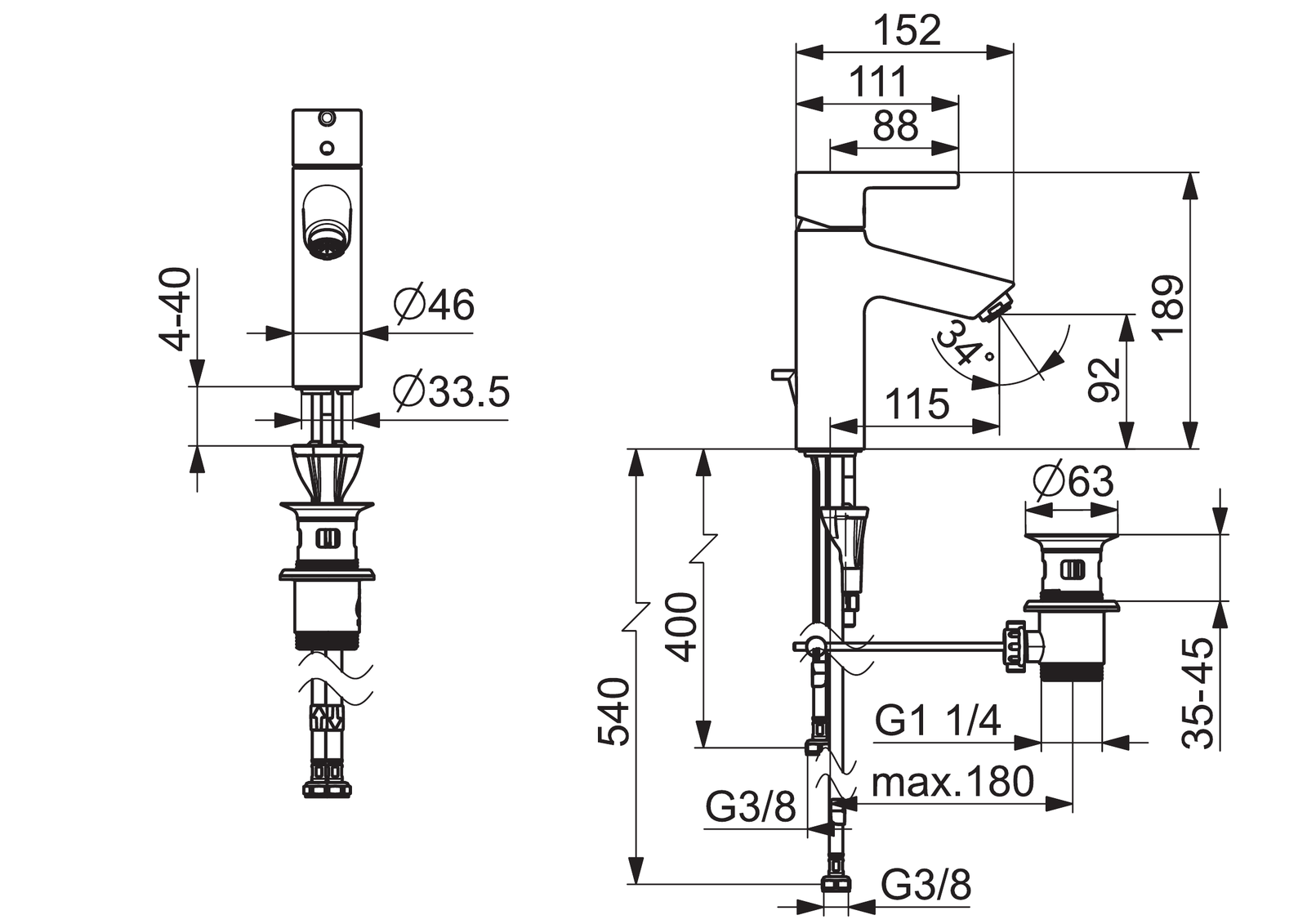 - Jedna ovládací páka / rukojeť; Pin - ovládací páka s tyčinkou; Páka se symboly teplé a studené vody