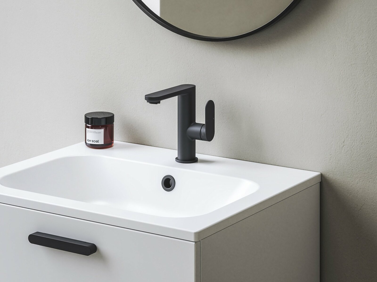 Stojánková umyvadlová baterie Chrome II s boční pákou, bez výpusti. V černém provedení. Funkce EcoFlow, která šetří spotřebu vody.- výška baterie: 164 mm, prodloužená s boční pákou pro větší komfort
