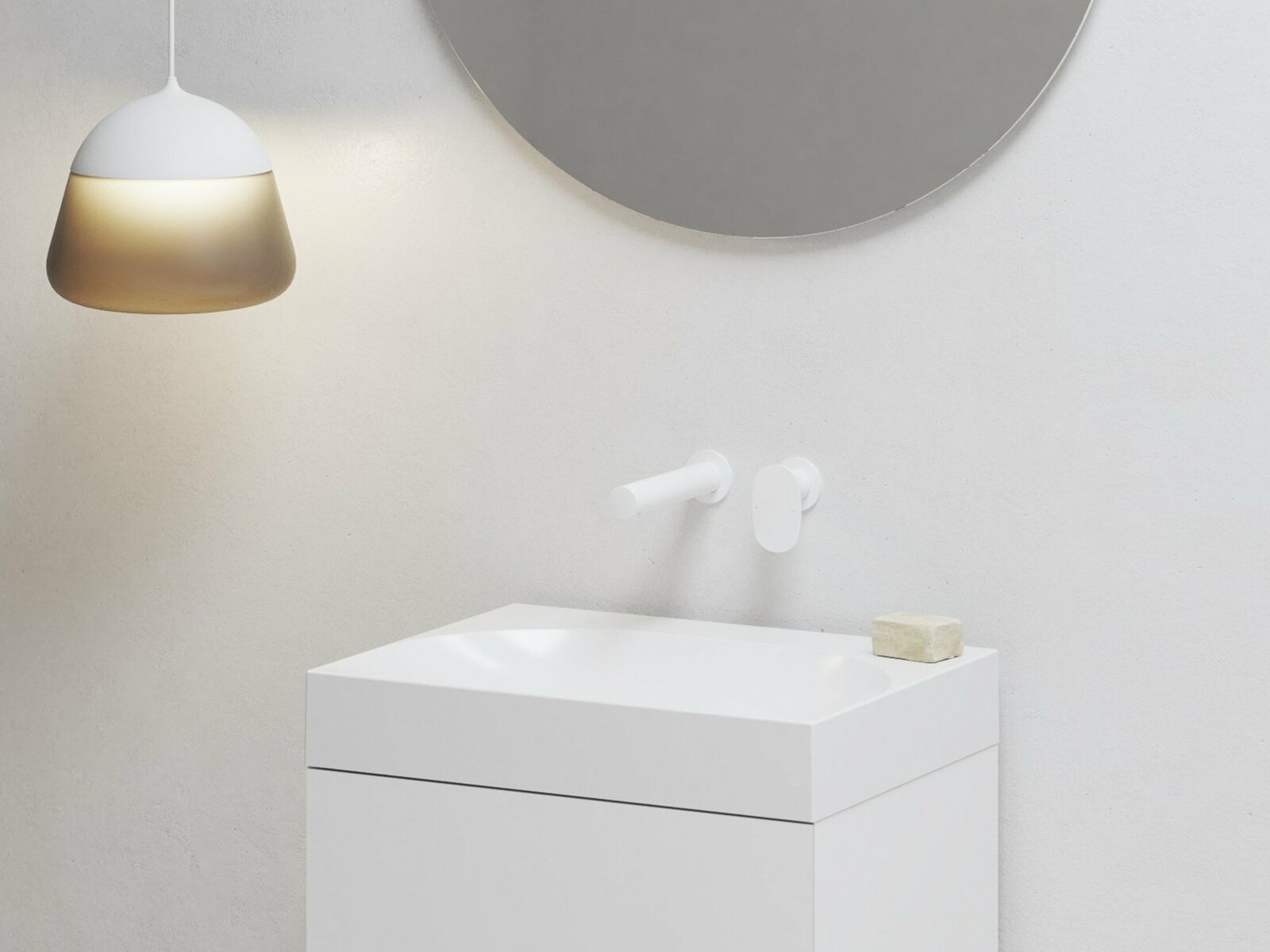 Podomítková umyvadlová baterie Spring, celotělová. V bílém matném provedení. Skrytý perlátor s funkcí EcoFlow.- délka výtokového ramínka: 203 mm