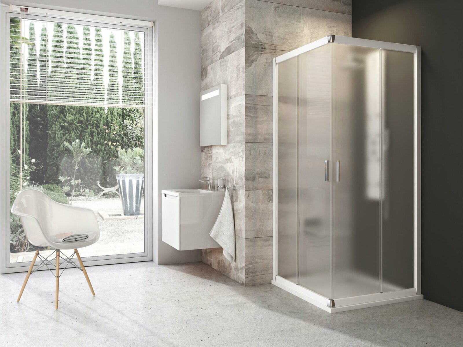 Čtyřdílný rohový sprchový kout Blix v bílém provedení a s výplní z neprůhledného skla s dekorem Grape s ochrannou vrstvou Ravak AntiCalc®. Posuvný systém otevírání.- rozměr: 90x90 cm