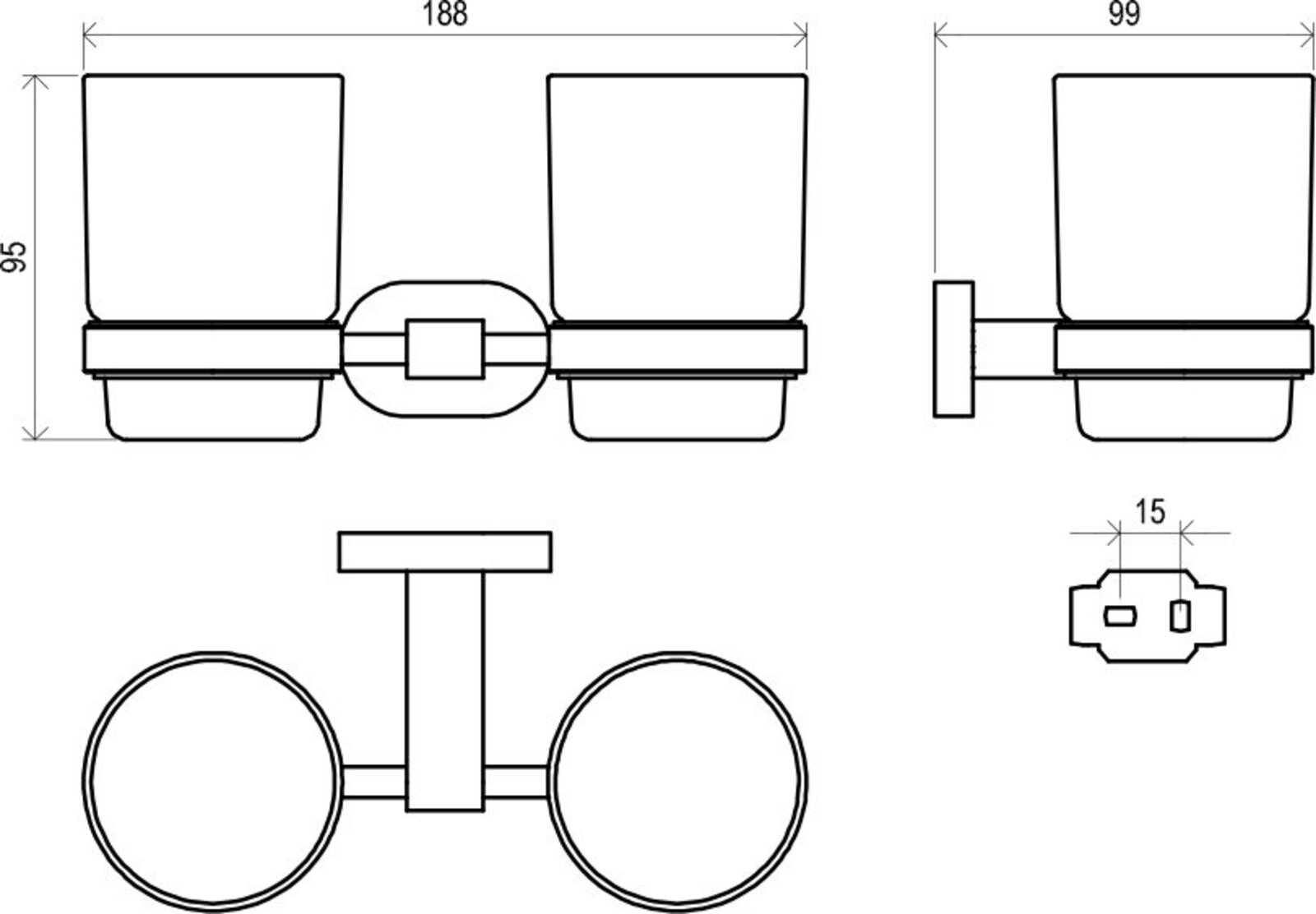 Na vnější čištění doporučujeme používat přípravek Ravak Cleaner Chrome. Montáž na dvě hmoždinky a ustavovací kovovou upínací desku. Rozteč šroubků je 16 mm. Dvojdržák je na vnitřní straně opatřen plastovým kroužkem pro měkké dosednutí skleněných pohárků.