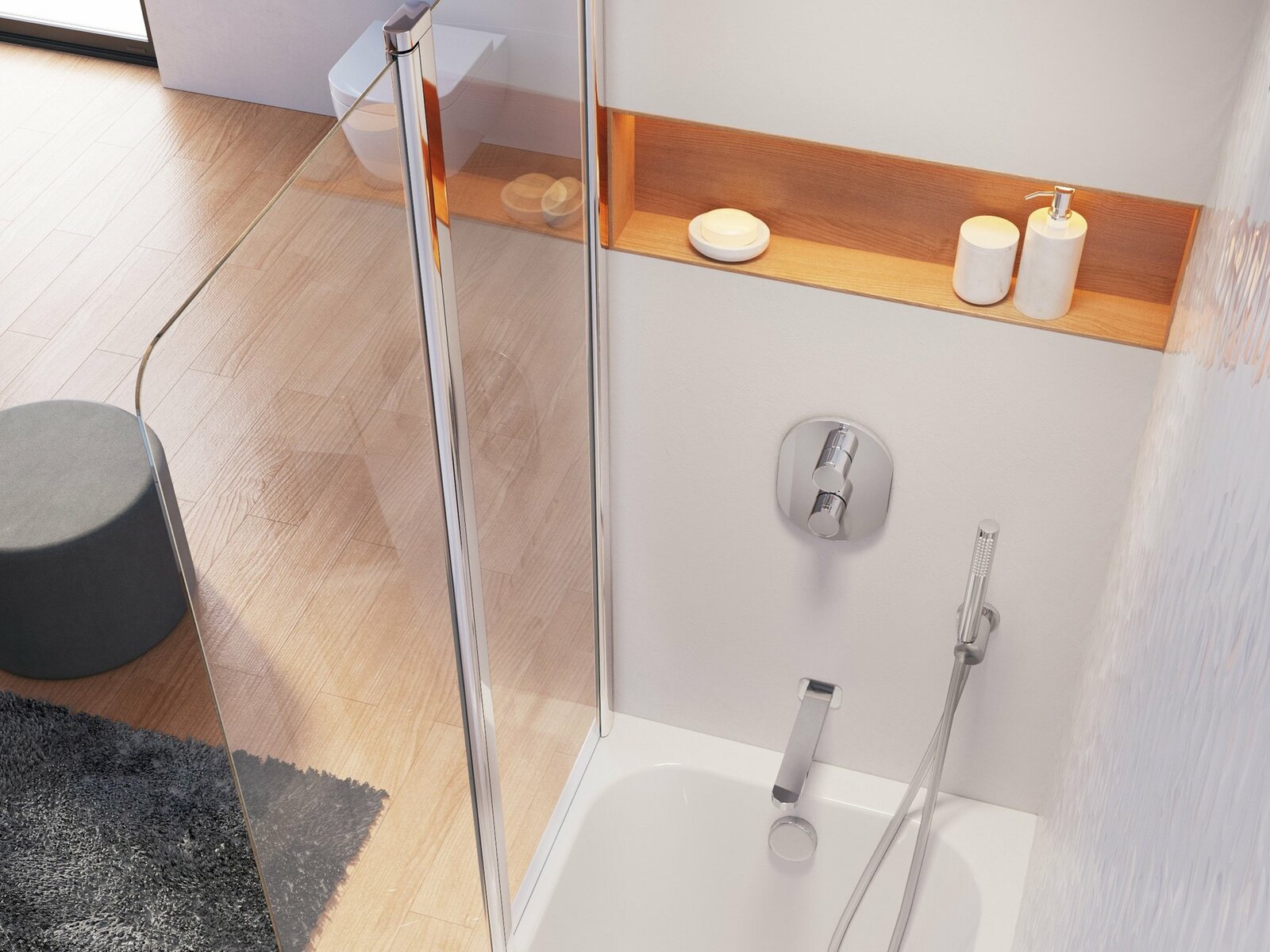 Dvoudílná pohyblivá vanová zástěna na obdélníkové vany. Díky otočnému sloupku lze její pohyblivý díl otevřít do vnitřního prostoru vany nebo vytočit ven. V provedení lesklý chrom a s výplní z čirého skla s ochrannou vrstvou Ravak AntiCalc®. Levá varianta.- rozměry: 100 cm