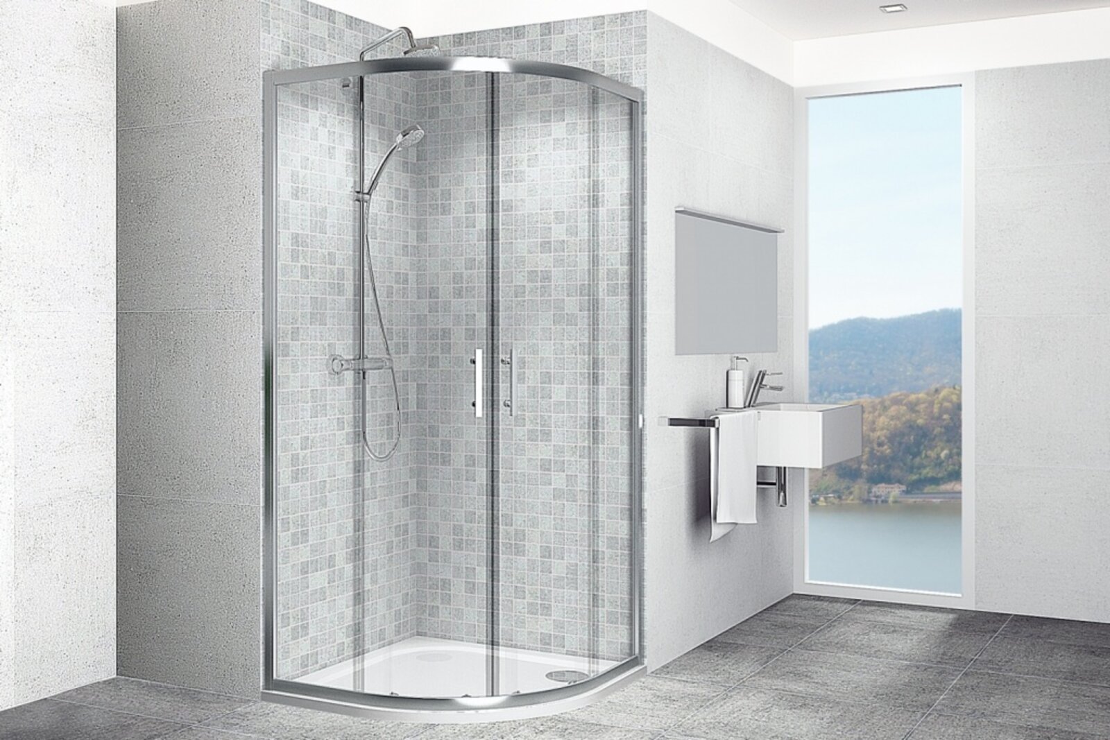 Sprchový kout čtvrtkruhový posuvný včetně vaničky z litého mramoru a sifonu T90. Srchový kout je tvořen z rámu z leštěného hliníkového profilu (polorám).