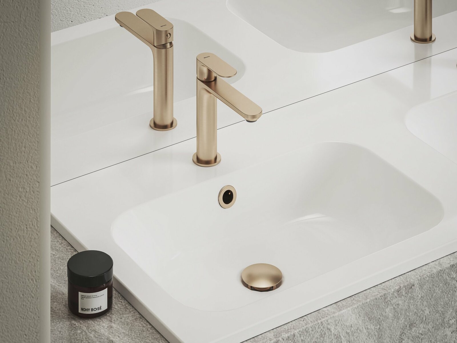 Stojánková umyvadlová baterie Eleganta, bez výpusti. V provedení Rose Gold Brushed. Zapuštěný perlátor s funkcí EcoFlow. Funkce BeCool, která šetří spotřebu vody.- výška baterie: 174 mm
