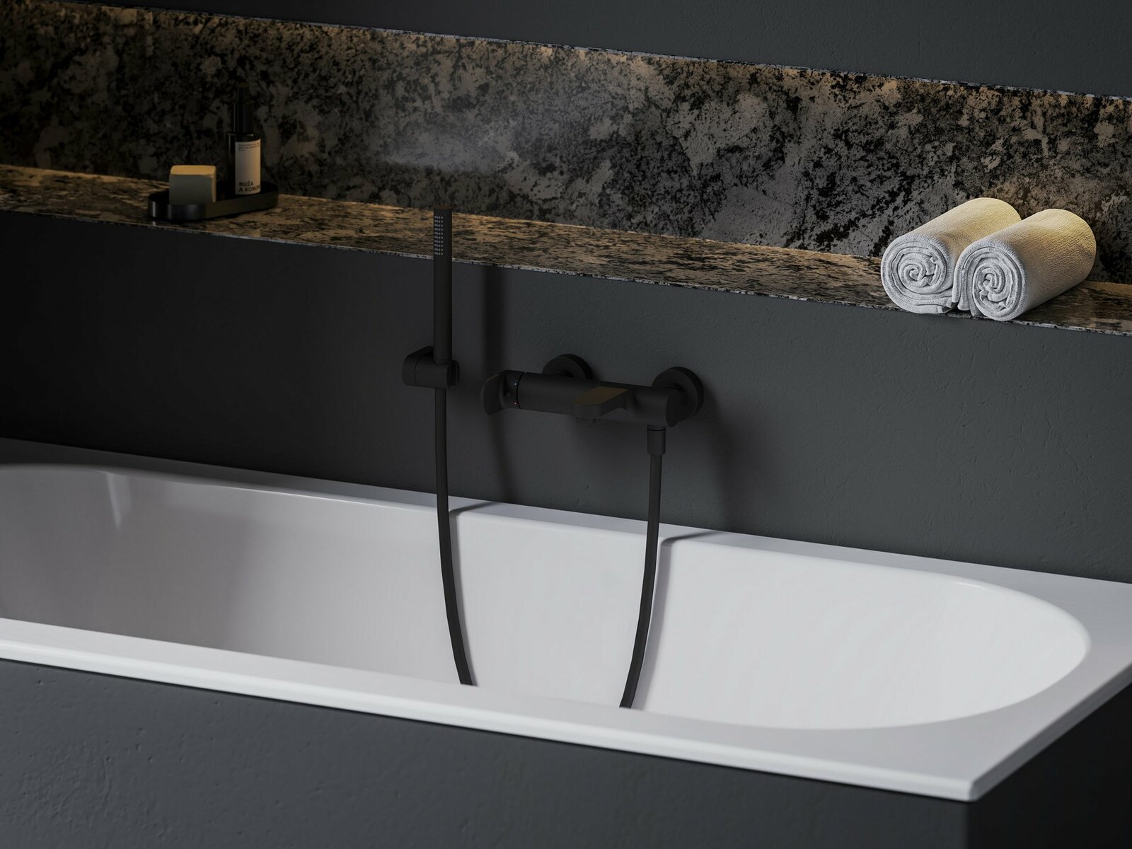 Nástěnná vanová baterie Eleganta, bez setu. V provedení Black Matt. Zapuštěný perlátor.- rozteč baterie: 150 mm