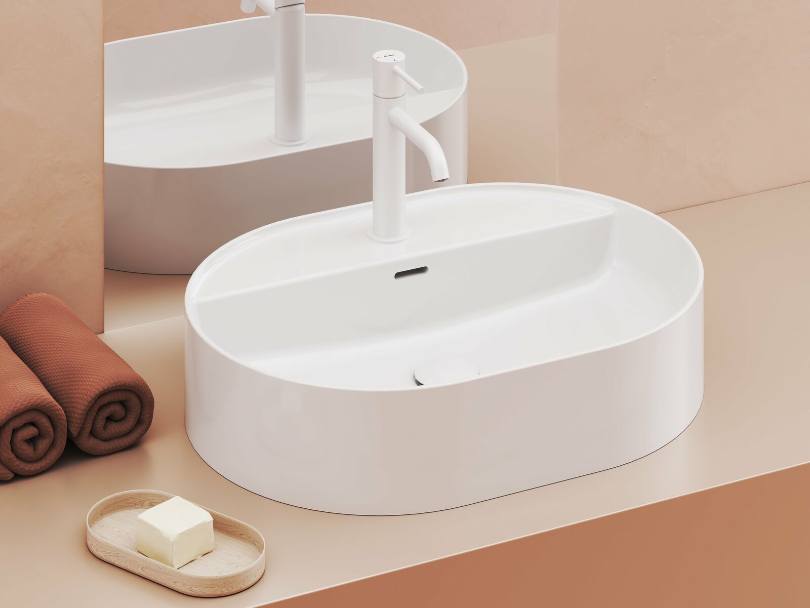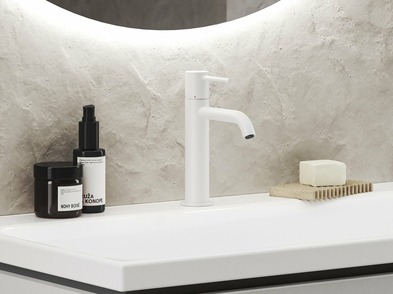 Stojánková umyvadlová baterie Espirit, bez výpusti. V provedení White Velvet. Skrytý perlátor s funkcí EcoFlow. Funkce BeCool, která šetří spotřebu vody.- výška baterie: 191 mm