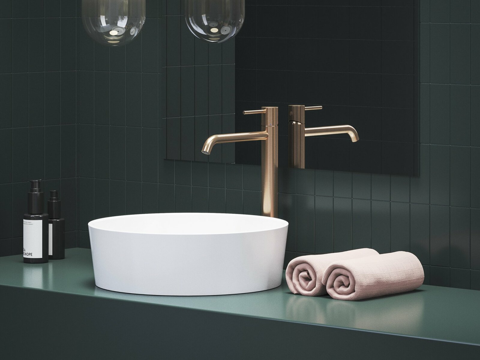 Stojánková umyvadlová baterie Espirit, bez výpusti. V provedení Rose Gold Brushed. Skrytý perlátor s funkcí EcoFlow. Funkce BeCool, která šetří spotřebu vody.- výška baterie: 341 mm