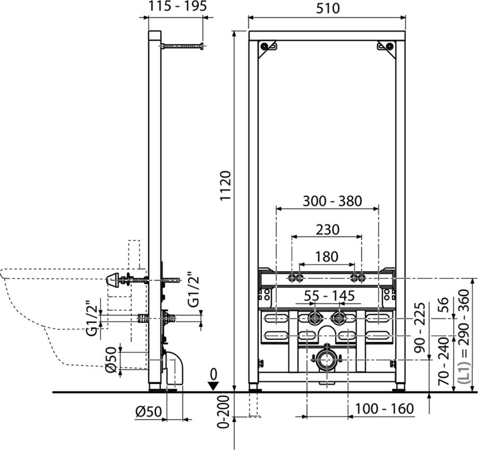 Předstěnový instalační modul pro bidet.- rozměry (š/h/v): 510 x 115 - 195 x 1120 mm