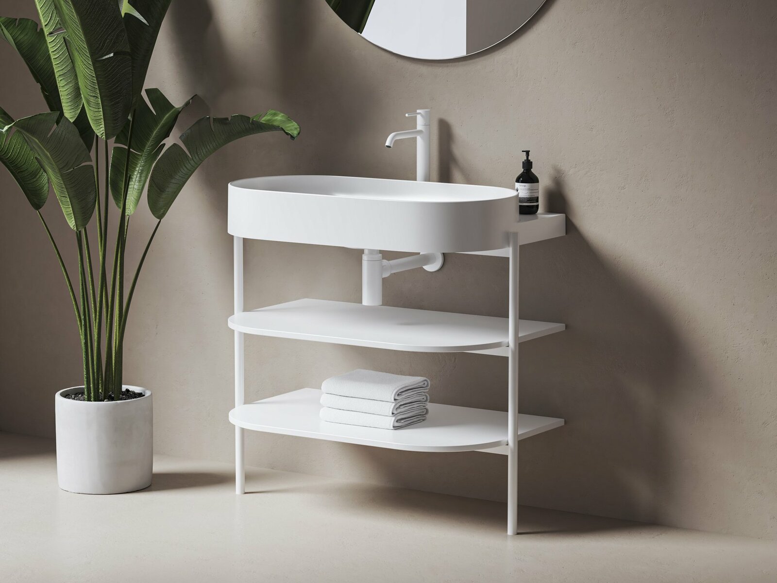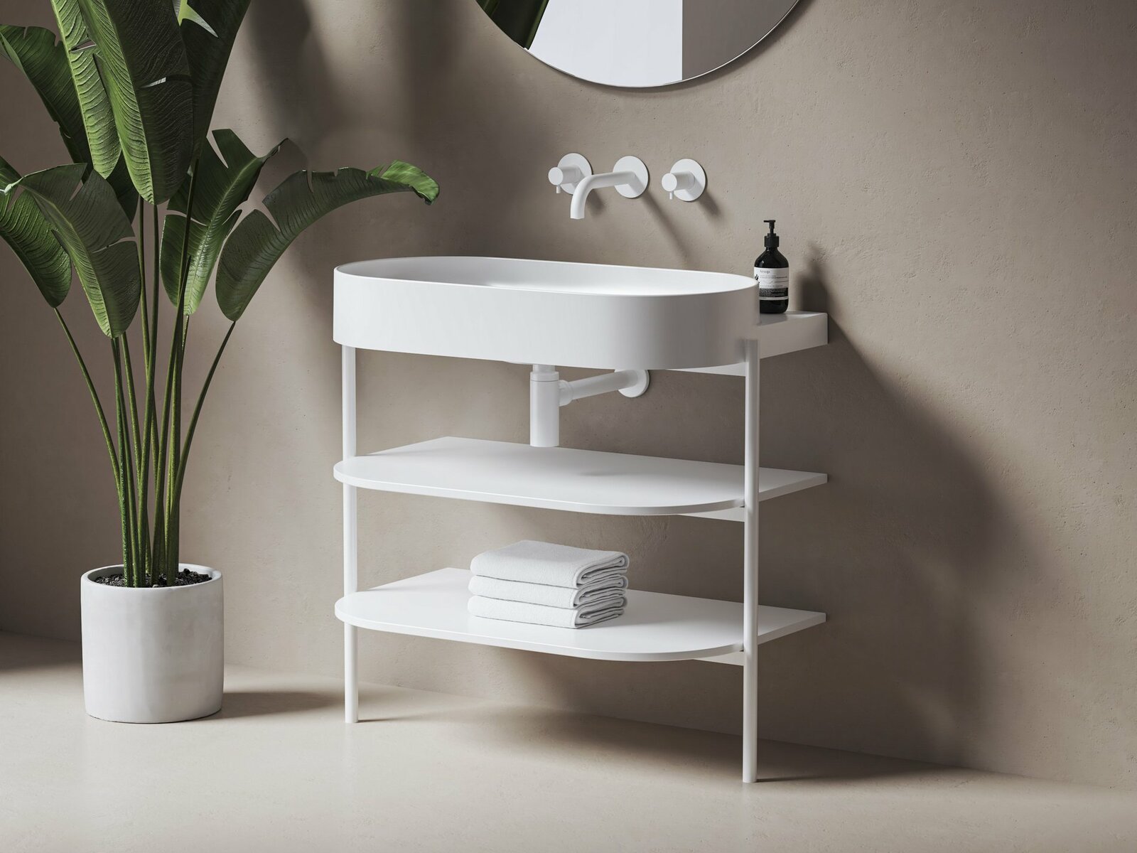 Stojící kovová konstrukce s policemi CS Yard 80 k instalaci umyvadla Yard 80. V bílém matném provedení.- rozměry (šxhxv): 86,8 x 49,5 x 76,5 cm