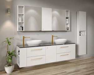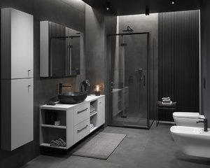 Přední část a korpus z lakované dřevotřísky. Pohodlná frézovaná rukojeť ve třech barvách (stříbrná, zlatá, černá) dostupná samostatně. Dvě prostorné zásuvky, mechanismus měkkého zavírání a šedé vnitřky zásuvek. Dřevotřísková deska, ze které je skříň vyrobena, má certifikaci FSC MIX 70% SGSCH-COC-007574. Skříň má dvě plné zásuvky; doporučujeme použít prostorově úsporný sifon.