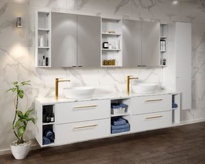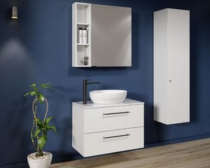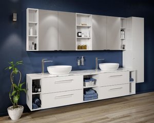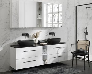 Přední část a korpus z lakované dřevotřísky. Pohodlná frézovaná rukojeť ve třech barvách (stříbrná, zlatá, černá) dostupná samostatně. Dvě prostorné zásuvky, mechanismus měkkého zavírání a šedé vnitřky zásuvek. Dřevotřísková deska, ze které je skříň vyrobena, má certifikaci FSC MIX 70% SGSCH-COC-007574. Skříň má dvě plné zásuvky; doporučujeme použít prostorově úsporný sifon.