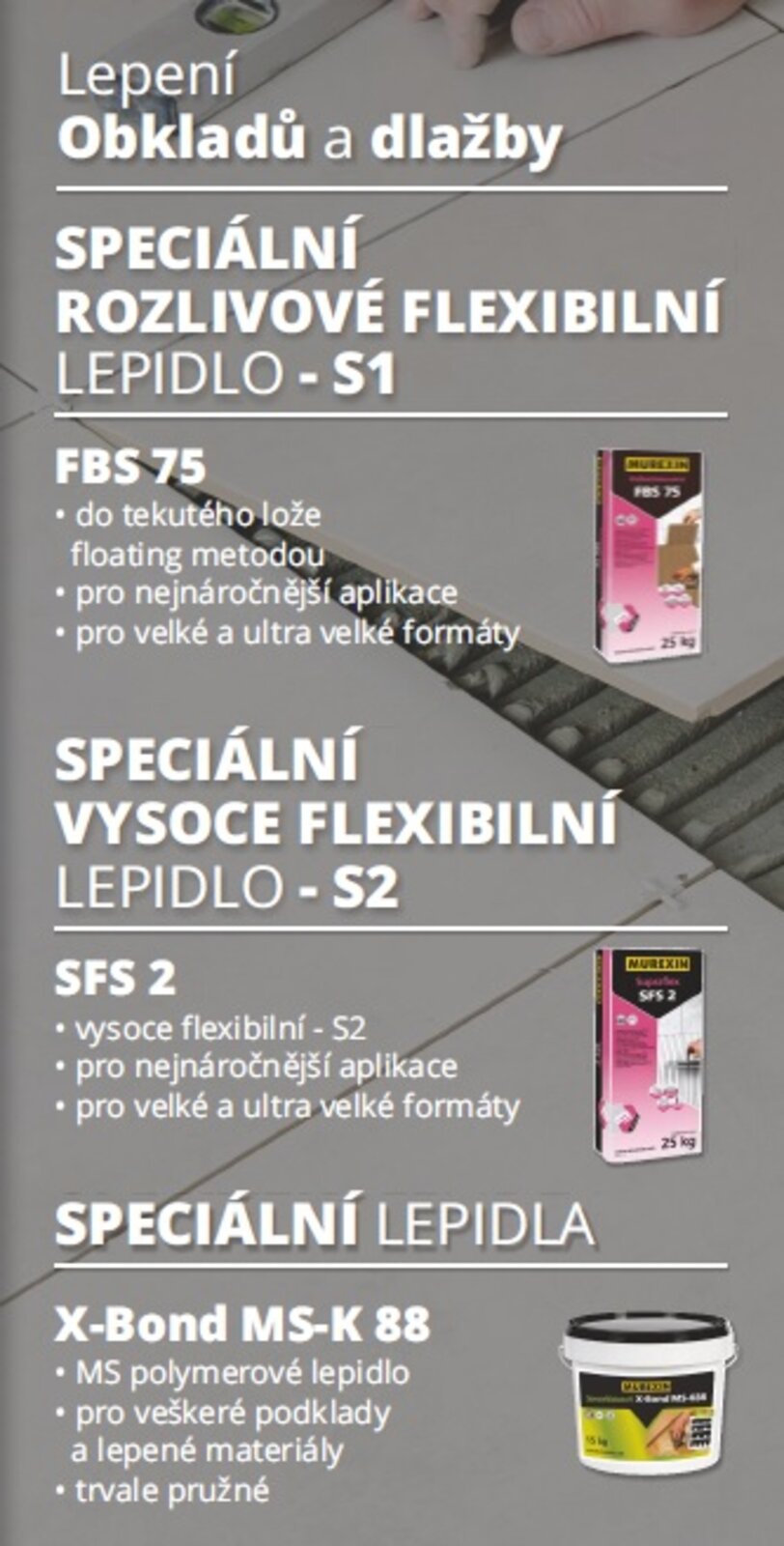 Flexibilní, prášková, vysoce zušlechtěná, hydraulicky tuhnoucí lepicí malta pro kladení dlažeb do tekutého lože floating metodou, odolná působení vody a mrazu. V interiéru i exteriéru ke kladení keramických dlaždic a desek, slinuté keramiky, klinkerů a štípaných dlažeb při zvýšeném statickém a tepelném zatížení. Speciálně určena pro lepení velkoformátové dlažby a neprůsvitného přírodního kamene.