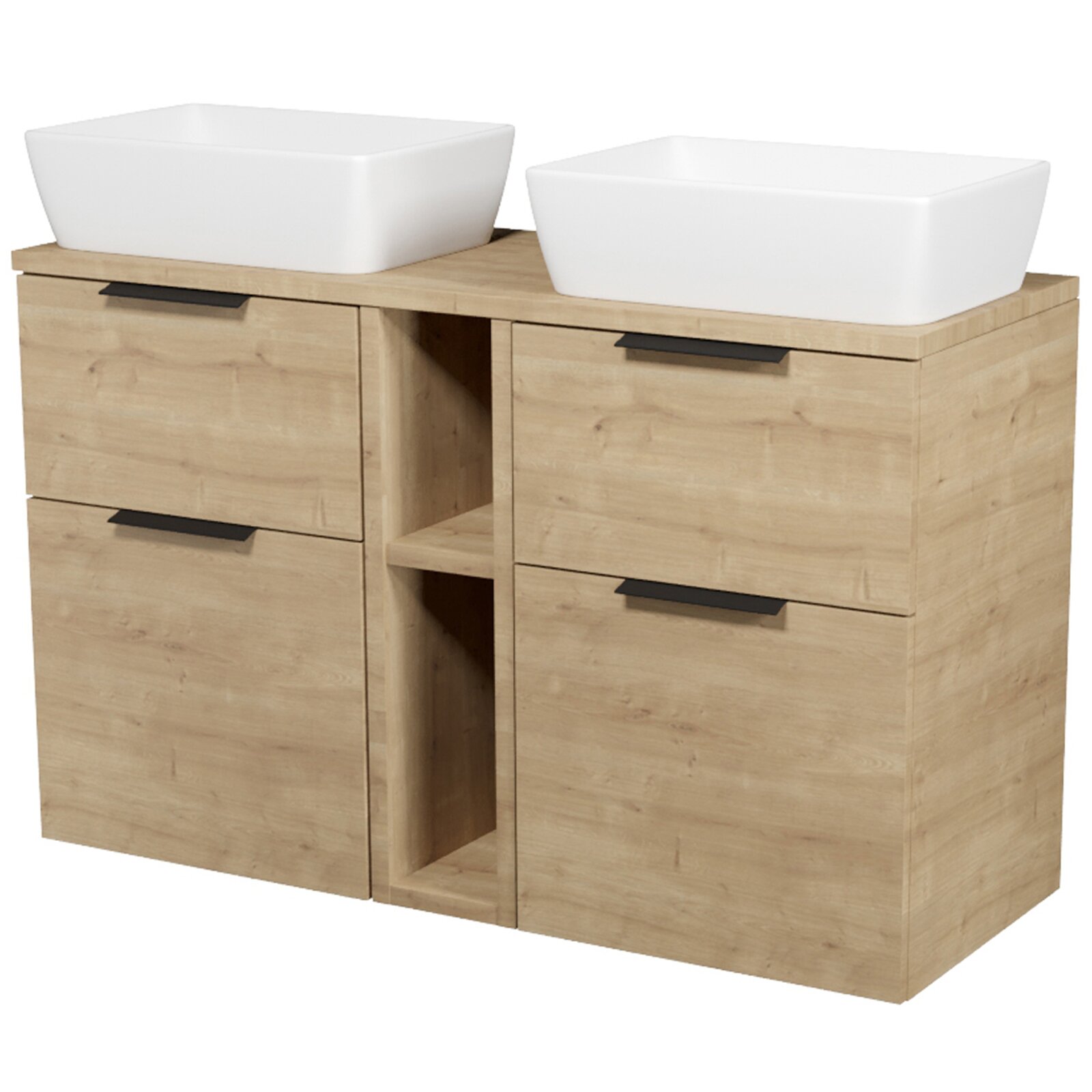 Nábytkový set Cersanit City 120, skříňka 50 pod desku dub 2x, skříńka 20 pod desku otevřená dub, deska 120 horní dub, umyvadlo City 50 na desku obdélníkové bílé 2x, úchytky černé