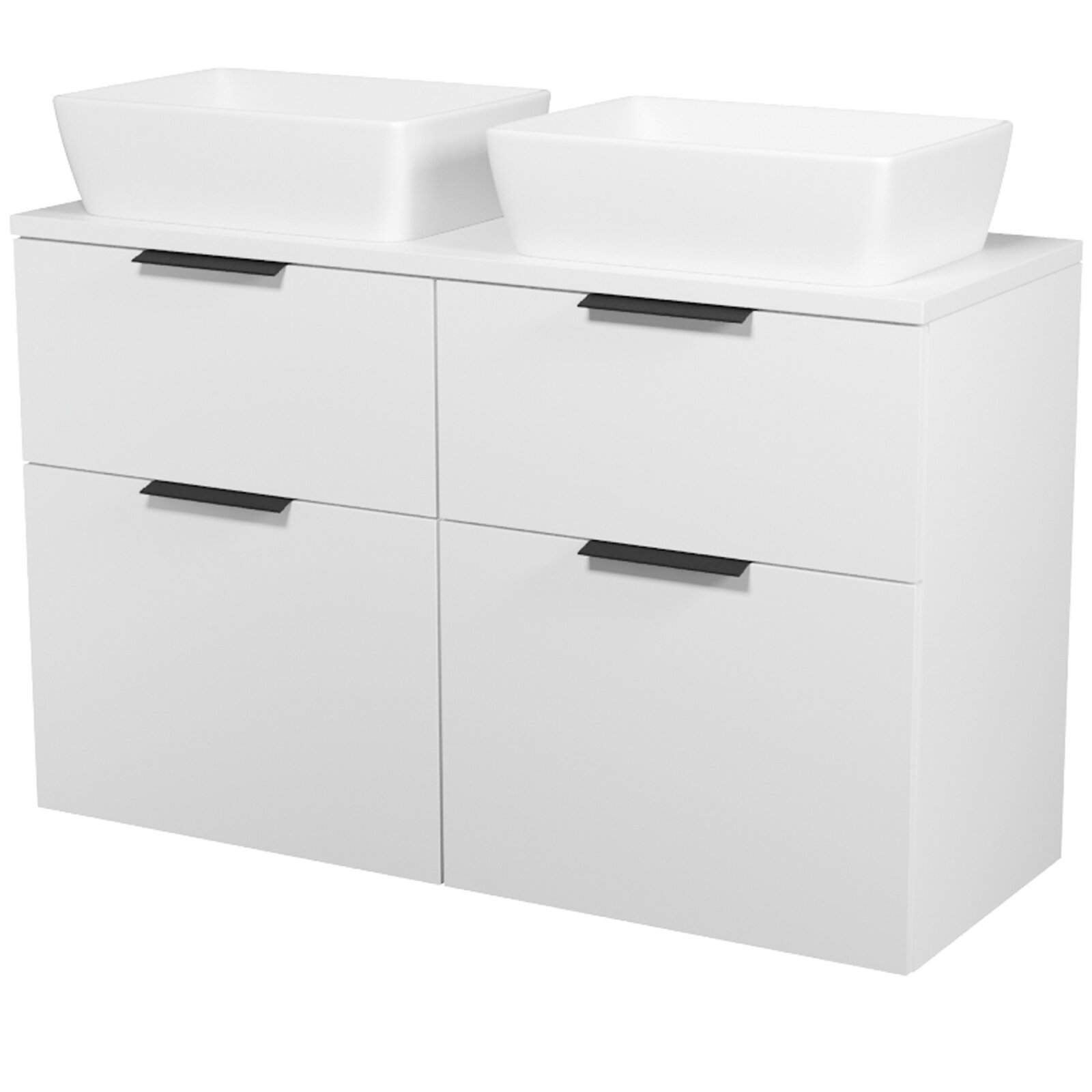 Nábytkový set Cersanit City 120, skříňka 60 pod desku bílá 2x, deska 120 horní bílá, umyvadlo City 50 na desku obdélníkové bílé 2x, úchytky černé