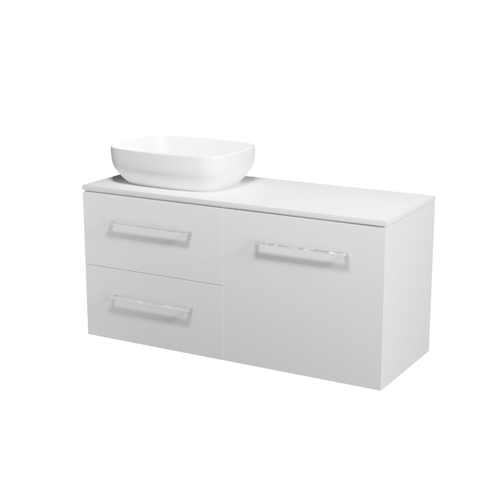 Nábytkový set Cersanit Larga 120, skříňka 60 pod desku bílá, skříňka 60 pod desku s košem na prádlo bílá, deska 120 horní bílá, umyvadlo Larga 50 na desku obdélníkové bílé, úchytky chrom