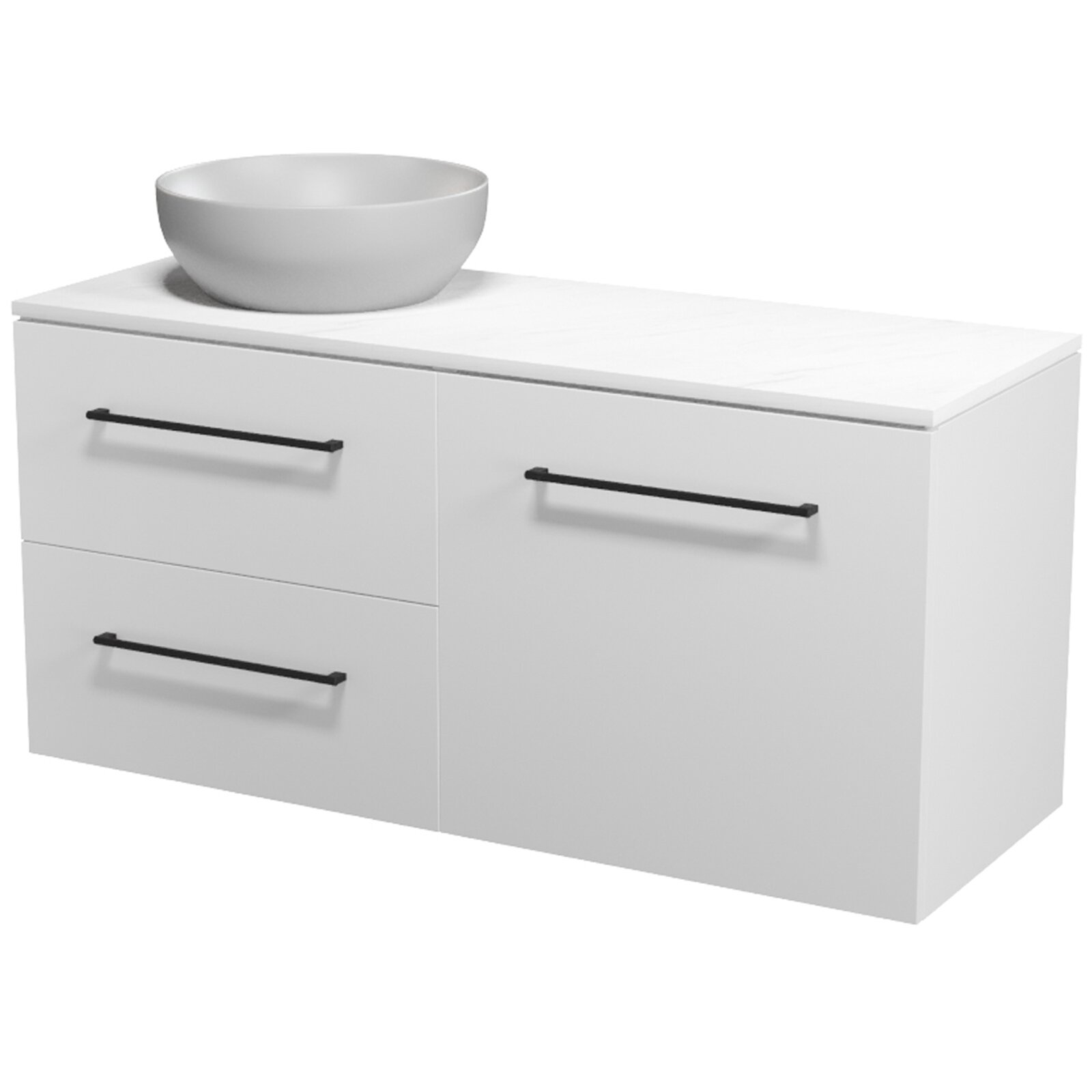 Nábytkový set Cersanit Larga 120, skříňka 60 pod desku bílá, skříňka 60 pod desku s košem na prádlo bílá, deska 120 horní bílý mramor, umyvadlo Larga 50 na desku kulaté šedé, úchytky černé