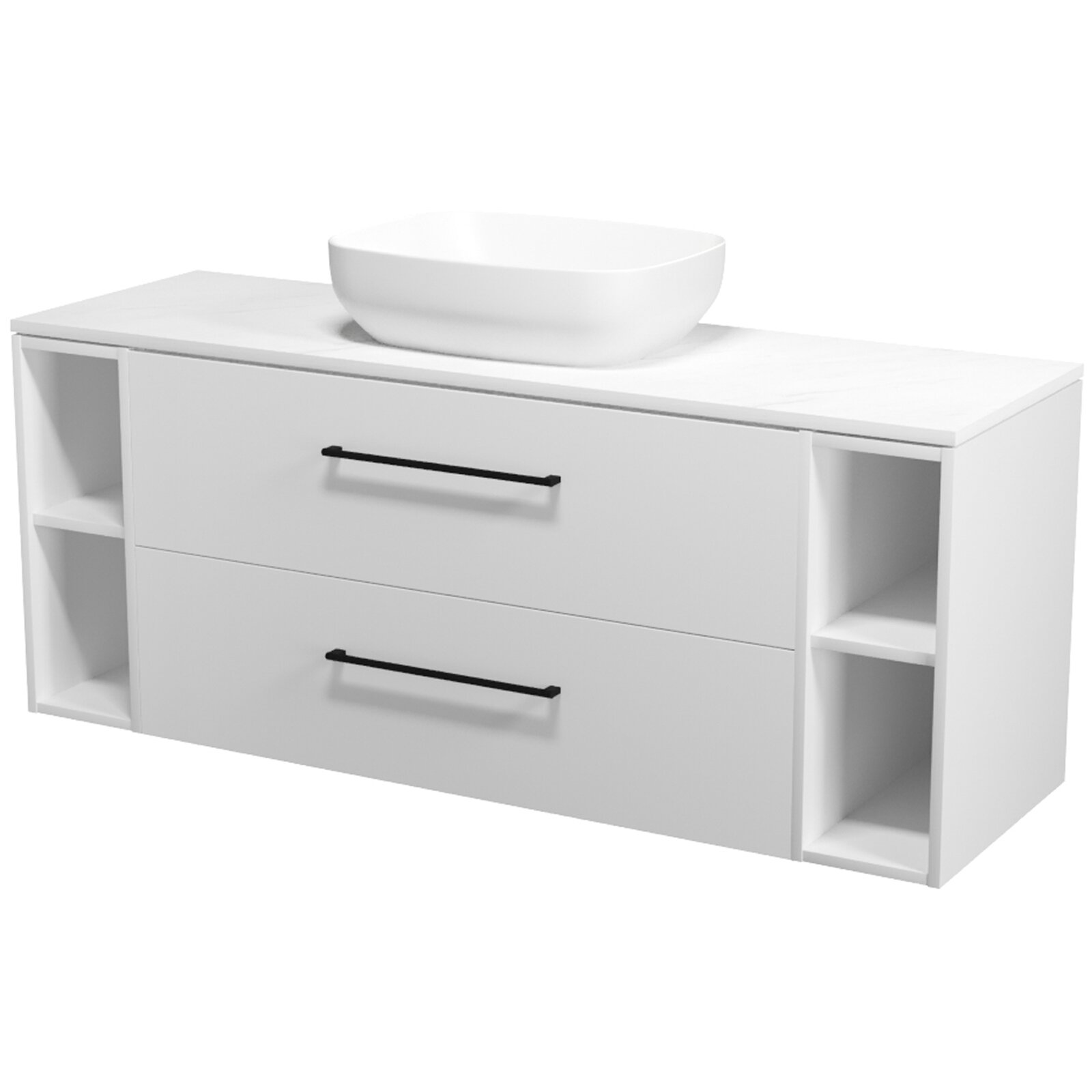Nábytkový set Cersanit Larga 140, skříňka 100 pod desku bílá, skříňka 20 pod desku otevřená bílá 2x, deska 140 horní bílý mramor, umyvadlo Larga 50 na desku obdélníkové bílé, úchytky černé