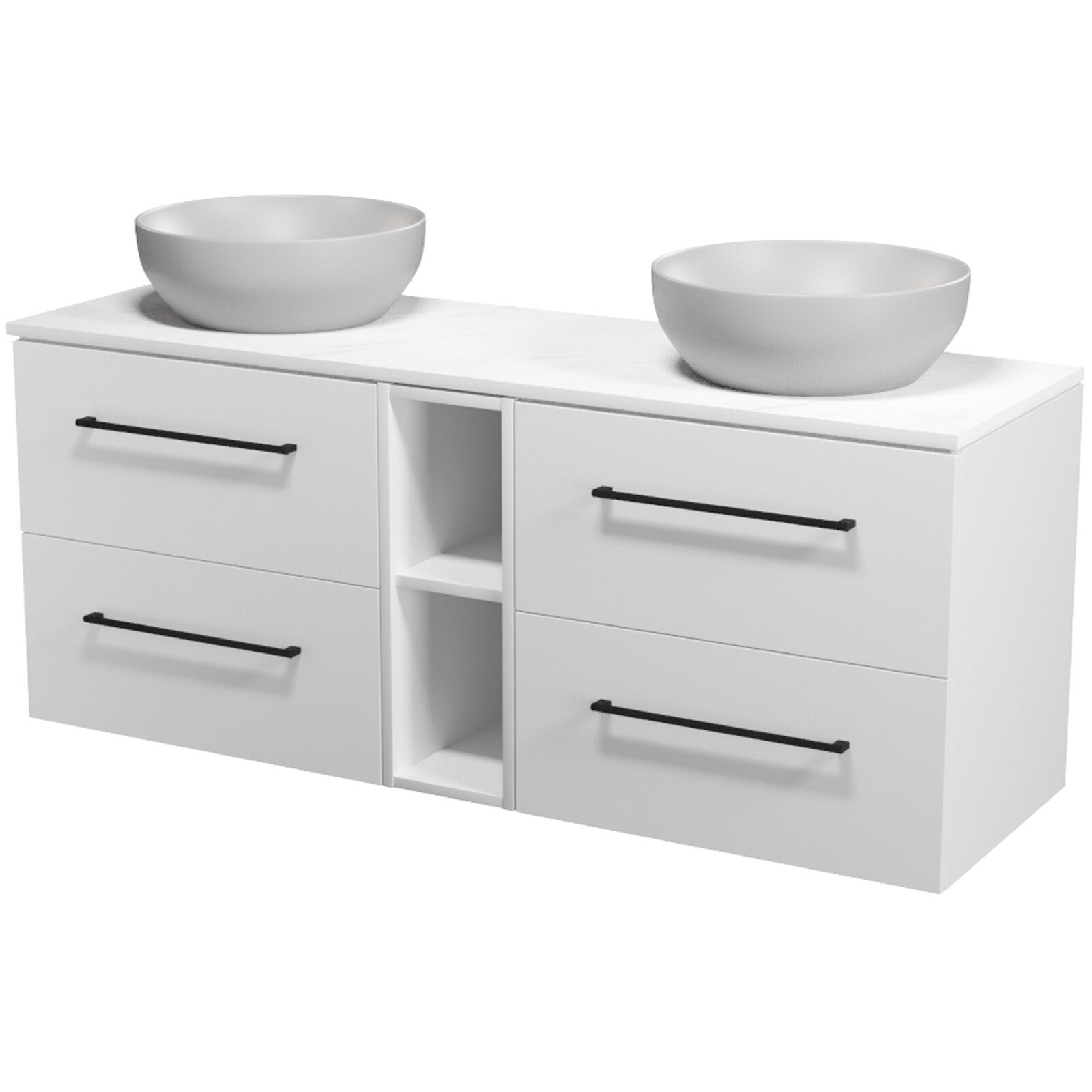 Nábytkový set Cersanit Larga 140, skříňka 60 pod desku bílá 2x, skříňka 20 pod desku otevřená bílá, deska 140 horní bílý mramor, umyvadlo Larga 40 na desku šedé 2x, úchytky černé