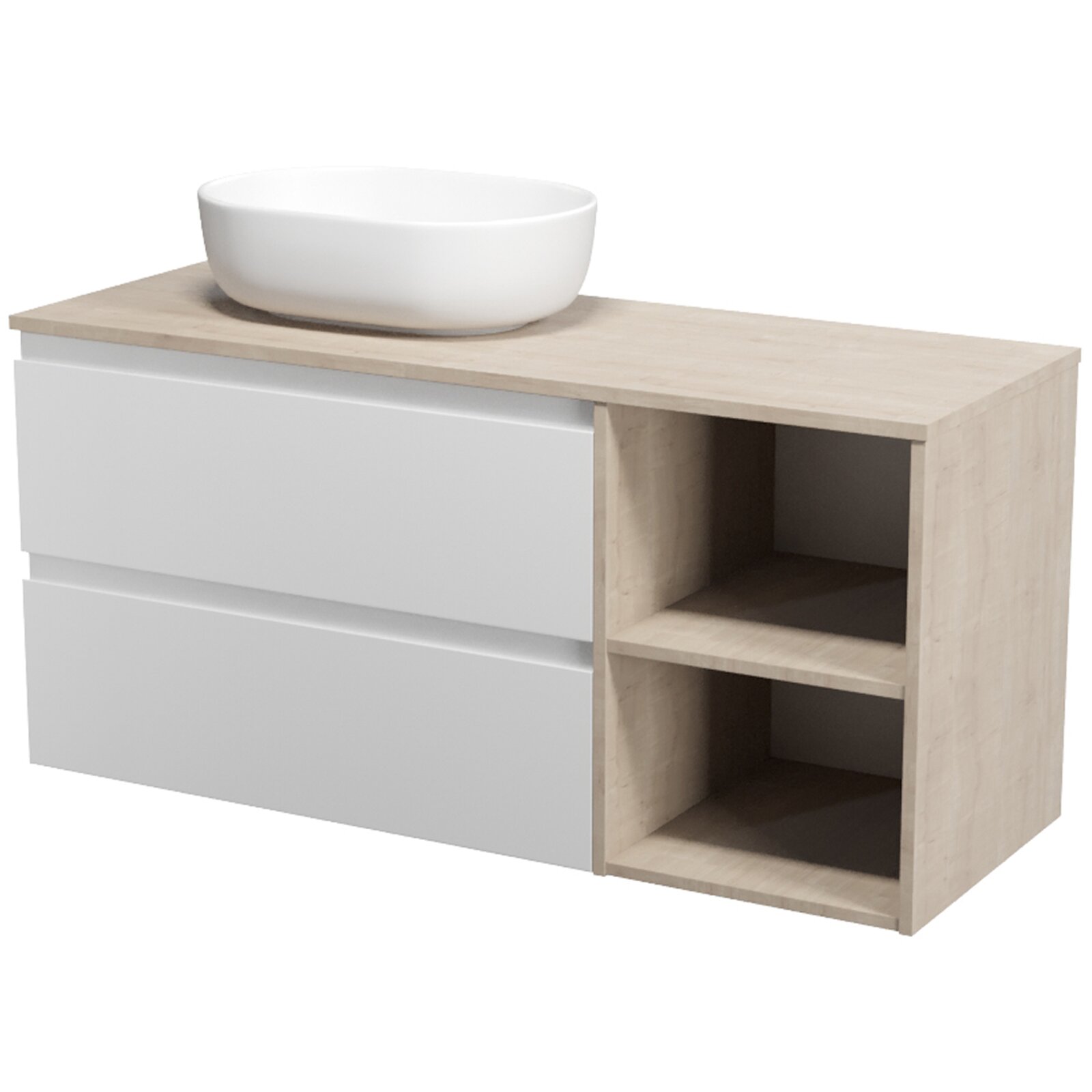 Nábytkový set Cersanit Moduo 120, skříňka 80 pod desku bílá, skříňka 40 pod desku dub, deska 120 dub, umyvadlo Moduo 50 na desku oválné bílé