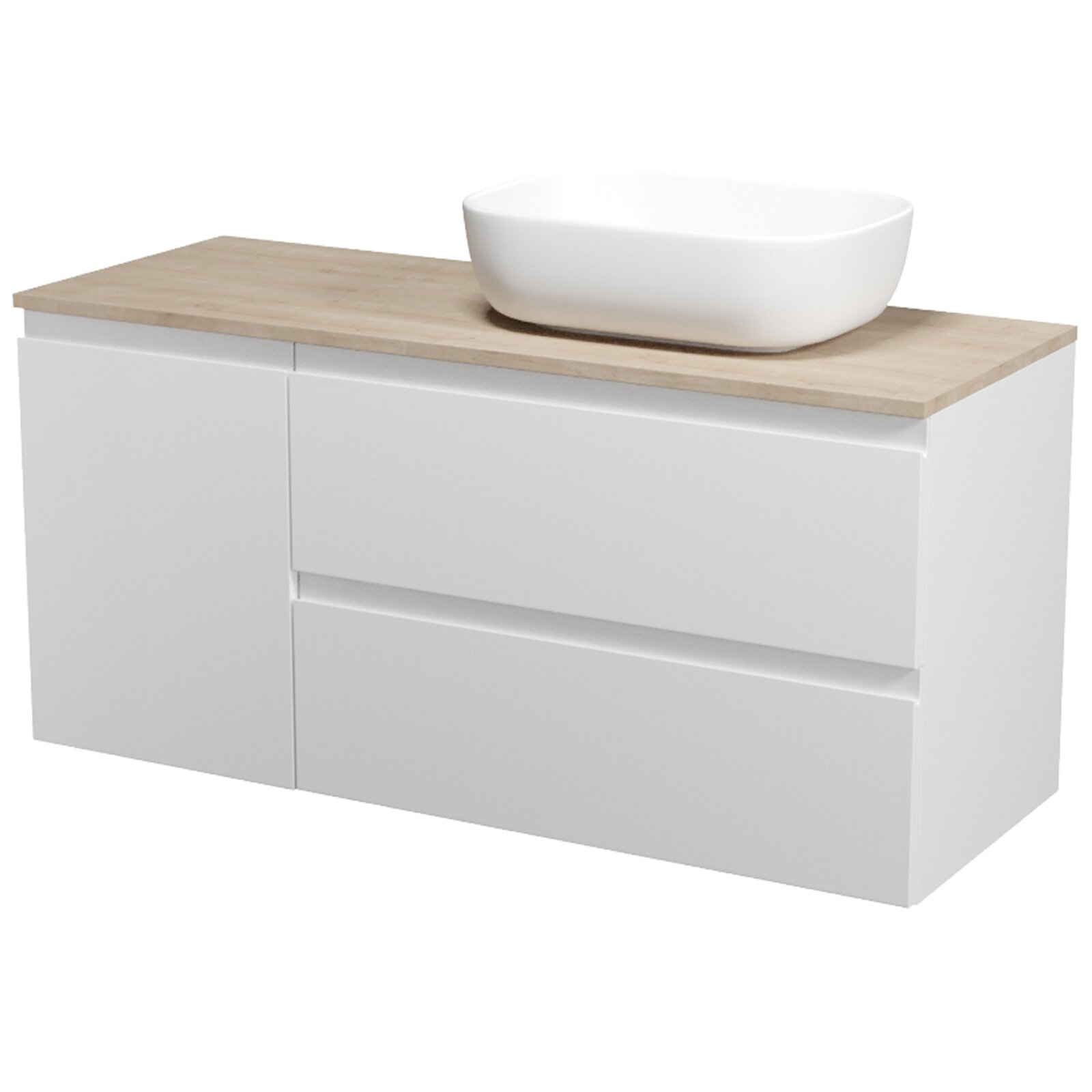 Nábytkový set Cersanit Moduo 120, skříňka 80 pod desku bílá, skříňka 40 pod desku s košem na prádlo bílá, deska 120 horní dub, umyvadlo Moduo 50 na desku obdélníkové bílé