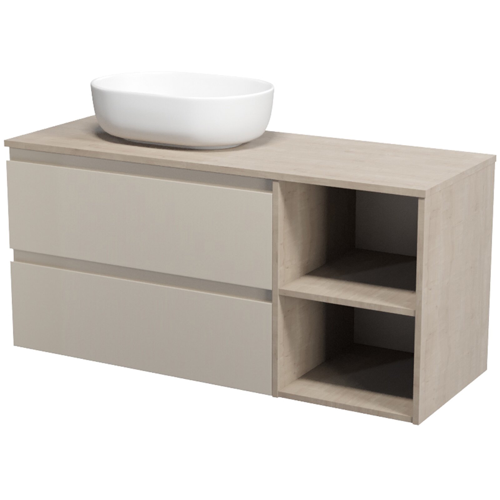 Nábytkový set Cersanit Moduo 120, skříňka 80 pod desku kašmír, skříňka 40 pod desku dub, deska 120 dub, umyvadlo Moduo 50 na desku oválné bílé