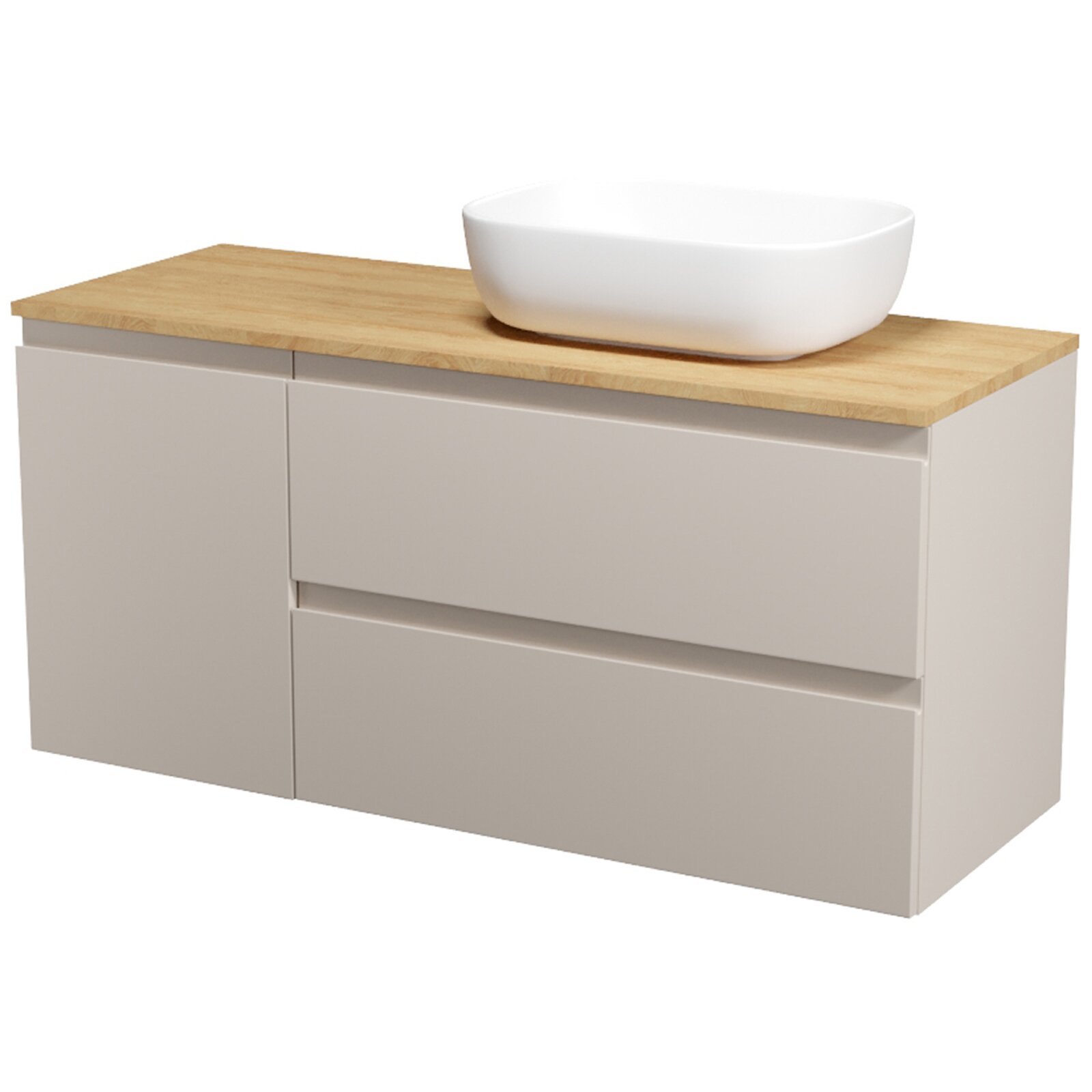 Nábytkový set Cersanit Moduo 120, skříňka 80 pod desku kašmír, skříňka 40 pod desku s košem na prádlo kašmír, deska 120 horní dub hikora, umyvadlo Moduo 50 na desku obdélníkové bílé