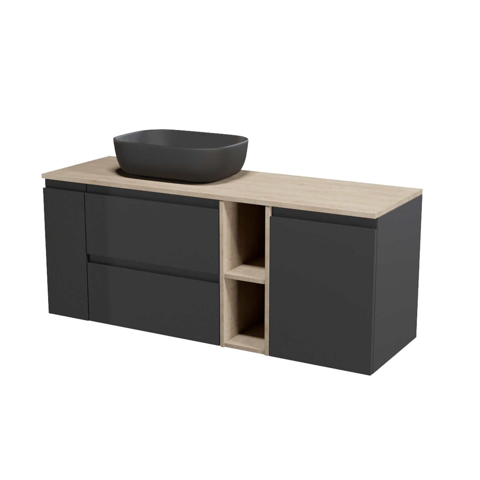 Nábytkový set Cersanit Moduo 140, skříňka 60 pod desku antracitová, skříňka 20 pod desku cargo antracitová, skříňka 20 pod desku otevřená dub, skříňka 40 pod desku s košem na prádlo antracitová, deska 140 horní dub, umyvadlo Moduo 50 na desku obdélníkové