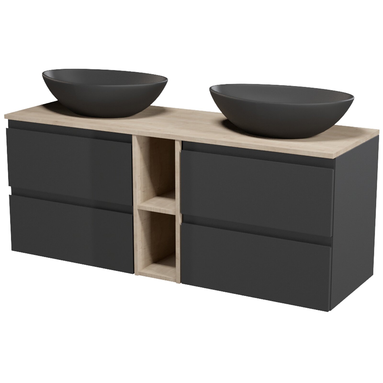 Nábytkový set Cersanit Moduo 140, skříňka 60 pod desku antracitové 2x, skříňka 20 pod desku otevřená dub, deska 140 horní dub, umyvadlo Moduo 55 na desku nepravidelné antracitové 2x