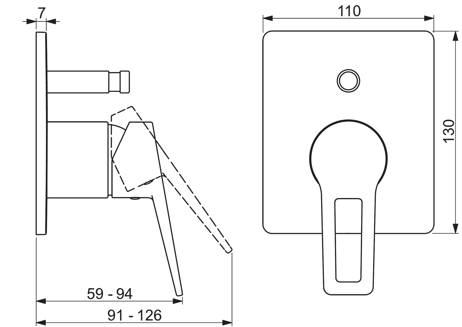 - Jedna ovládací páka / rukojeť; Třmenová páka; Páka se symboly teplé a studené vody