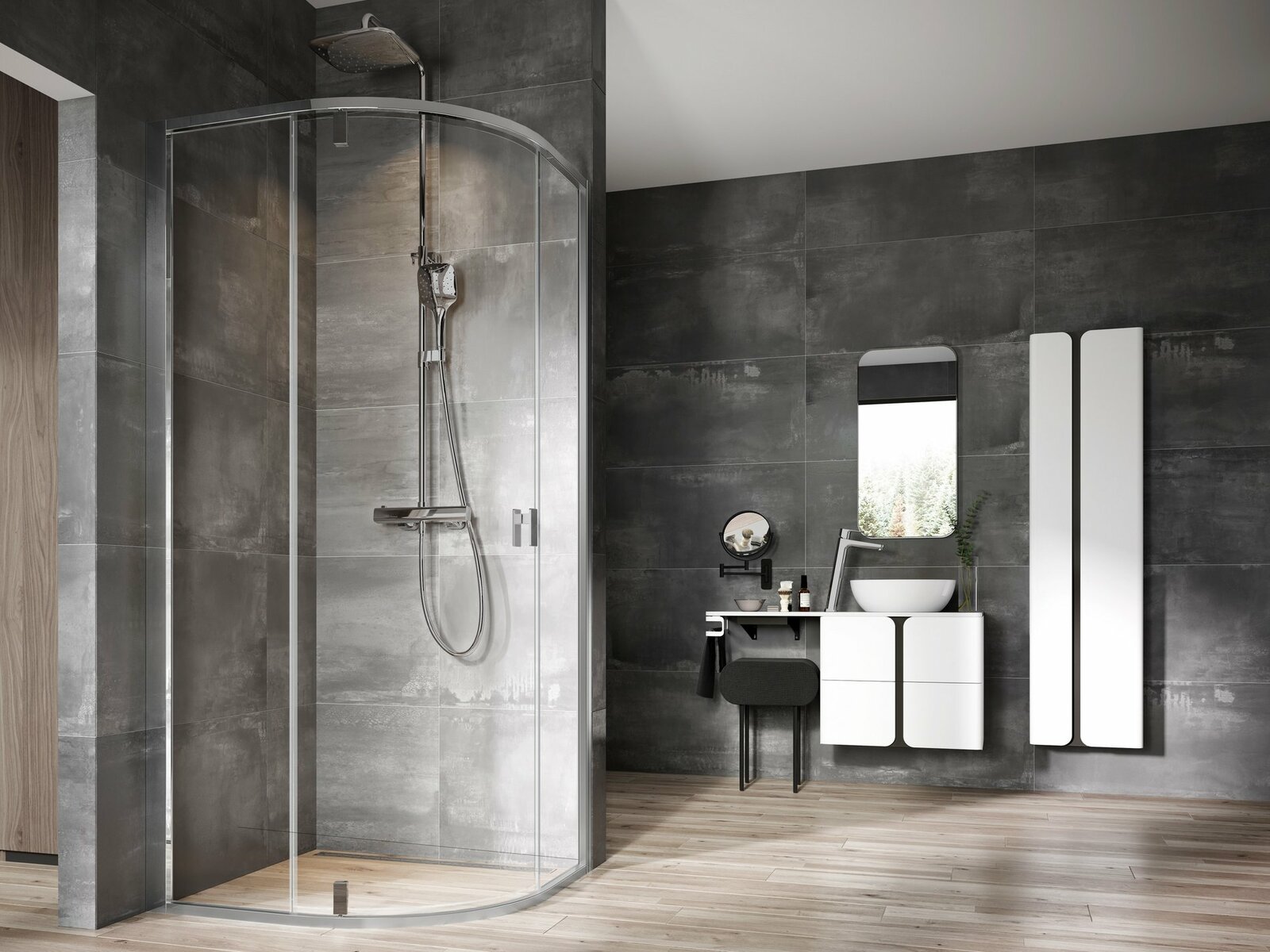 Třídílný čtvrtkruhový sprchový kout Nexty v provedení lesklý chrom a s výplní z čirého skla s ochrannou vrstvou Ravak AntiCalc®. Otočný pivotový systém otevírání. Otočitelný výrobek pro levou i pravou variantu.- rozměr: 80x80 cm