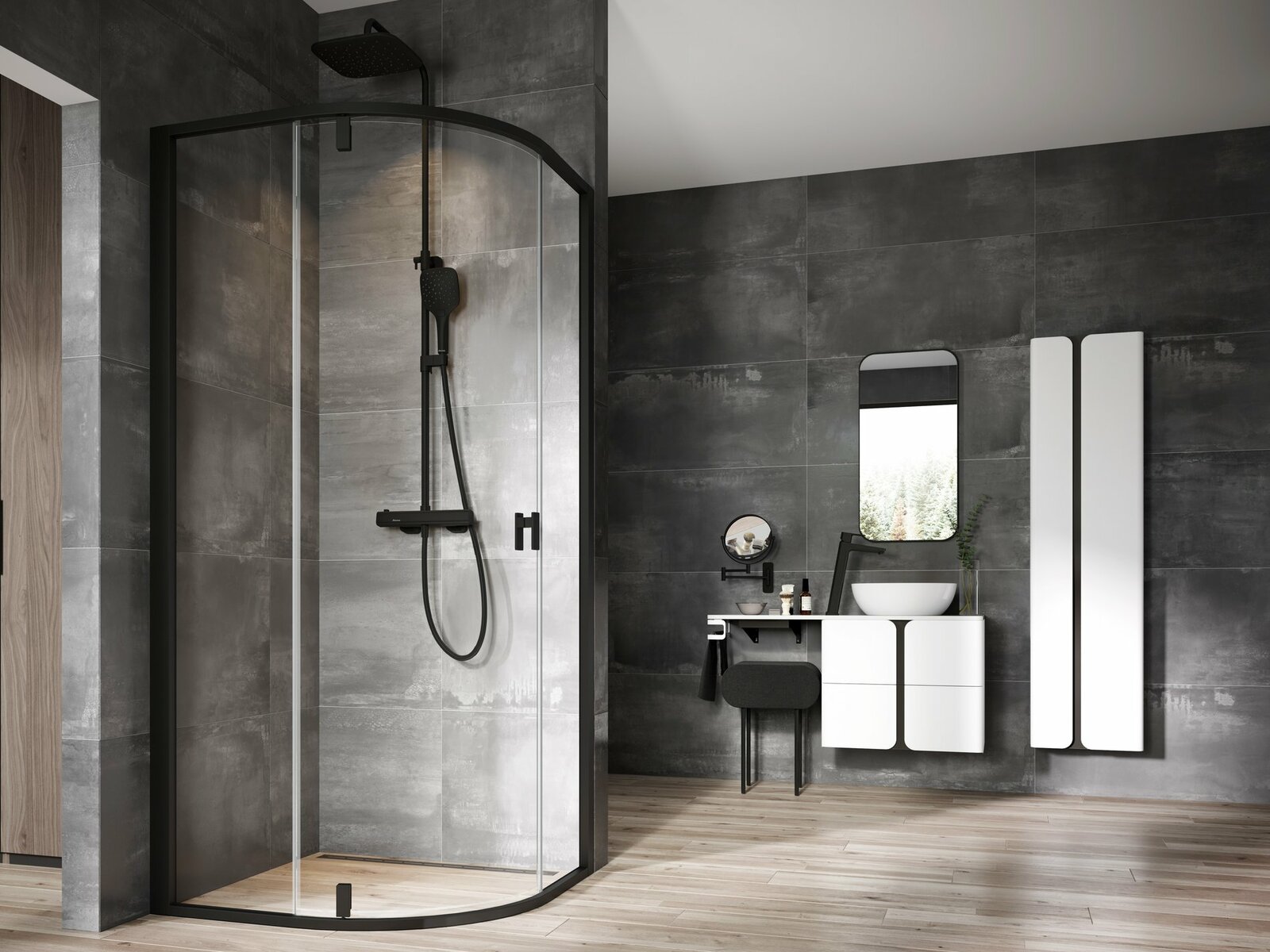 Třídílný čtvrtkruhový sprchový kout Nexty v černém provedení a s výplní z čirého skla s ochrannou vrstvou Ravak AntiCalc®. Otočný pivotový systém otevírání. Otočitelný výrobek pro levou i pravou variantu.- rozměr: 90x90 cm