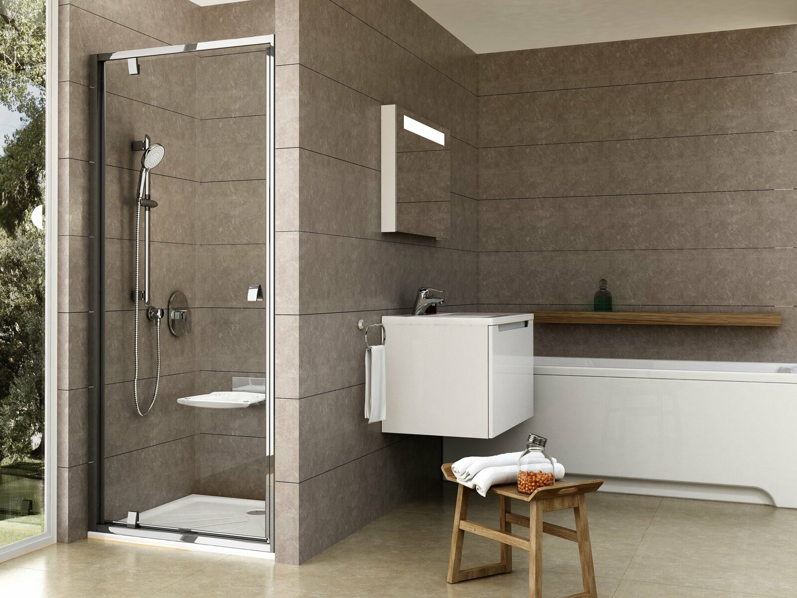 Výrobek se skládá z jednoho rovného otočného dílu, který tvoří dveře. Otočením výrobku o 180° získáte levou nebo pravou variantu otevírání dveří. Montuje se do obloženého rohu koupelny (ideálně do vyzděné niky nebo v kombinaci s pevnou stěnou PPS) na vaničky Ravak Aneta, Angela, Perseus, Perseus Pro, Perseus Pro Flat, Perseus Pro Chrome, Gigant Pro, Gigant Pro Flat, Gigant Pro Chrome nebo přímo na podlahu se zabudovaným odtokovým žlabem či podlahovou vpustí. Kombinací se dvěma pevnými stěnami typu PPS vytvoříte sprchový kout ve tvaru „U“. Použitím nastavovacího profilu PNPS lze výrobky rozšířit o 20 mm, proto se dokonale přizpůsobí stavebním nerovnostem až o 4 cm na každé straně.