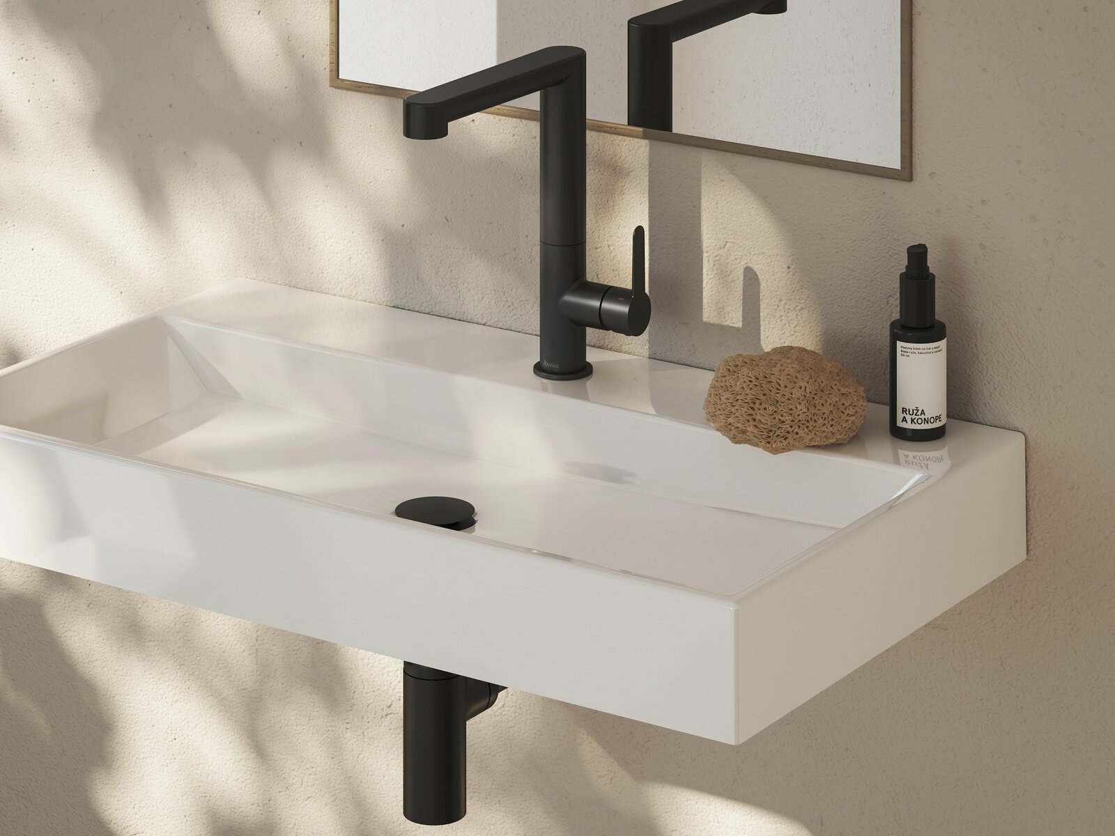 Stojánková umyvadlová/dřezová baterie Puri, bez výpusti. V černém provedení. Perlátor s funkcí FlexiFlow.- kartuš (průměr, materiál): 25 mm, keramická